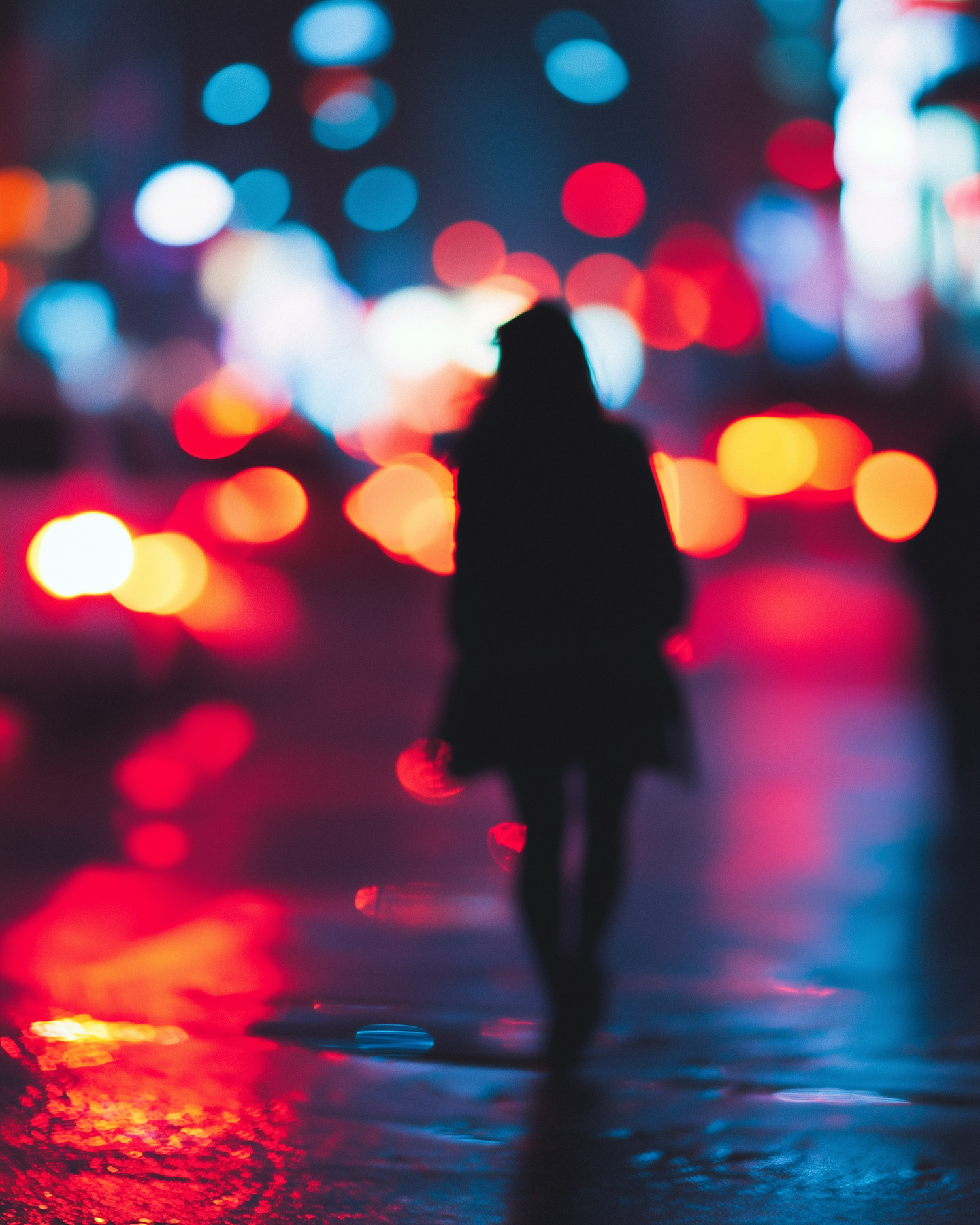 Silhouette of a person walking in a city at night with vibrant bokeh lights and reflections on wet pavement, creating a dreamy atmosphere.
