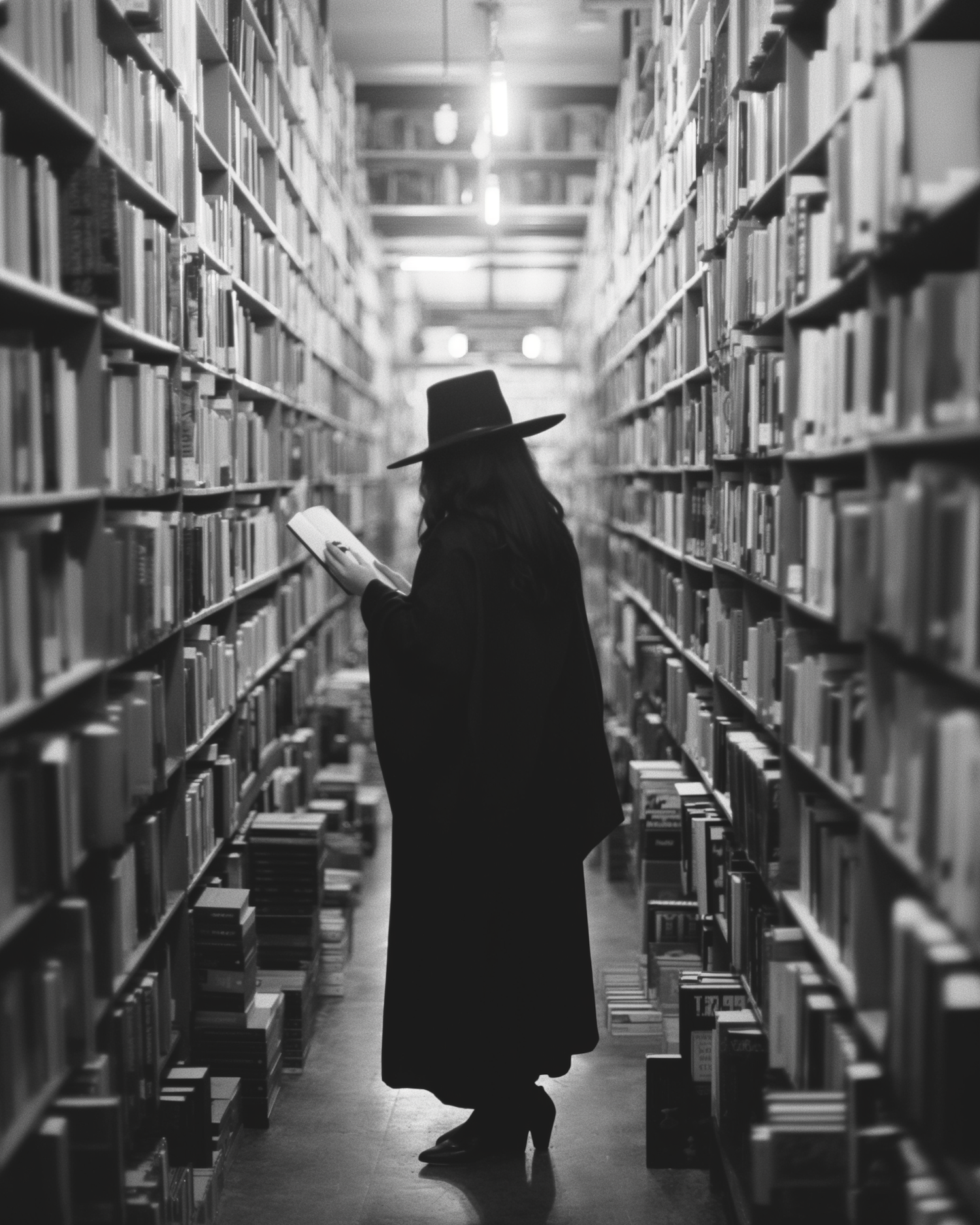 A mysterious figure in a wide-brimmed hat reads a book in a dimly lit library aisle, surrounded by towering shelves of books.