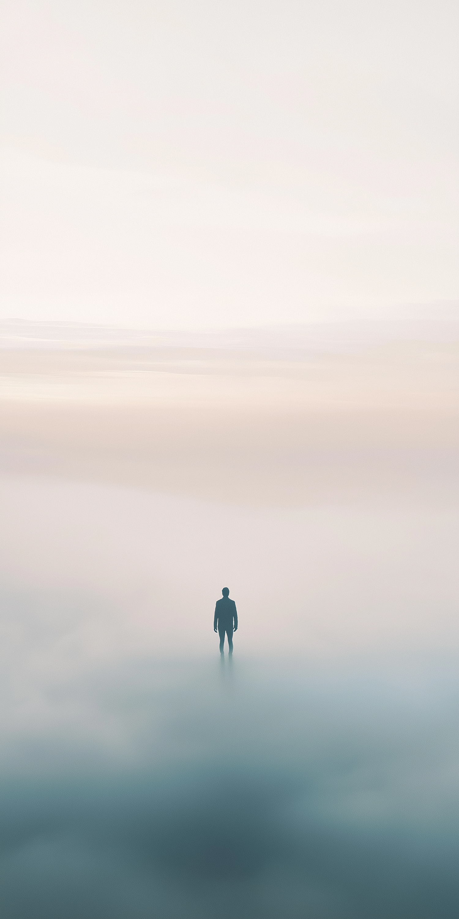 A lone silhouette stands in a vast, misty expanse with soft gradients of blue and beige, creating a serene and dreamlike atmosphere.