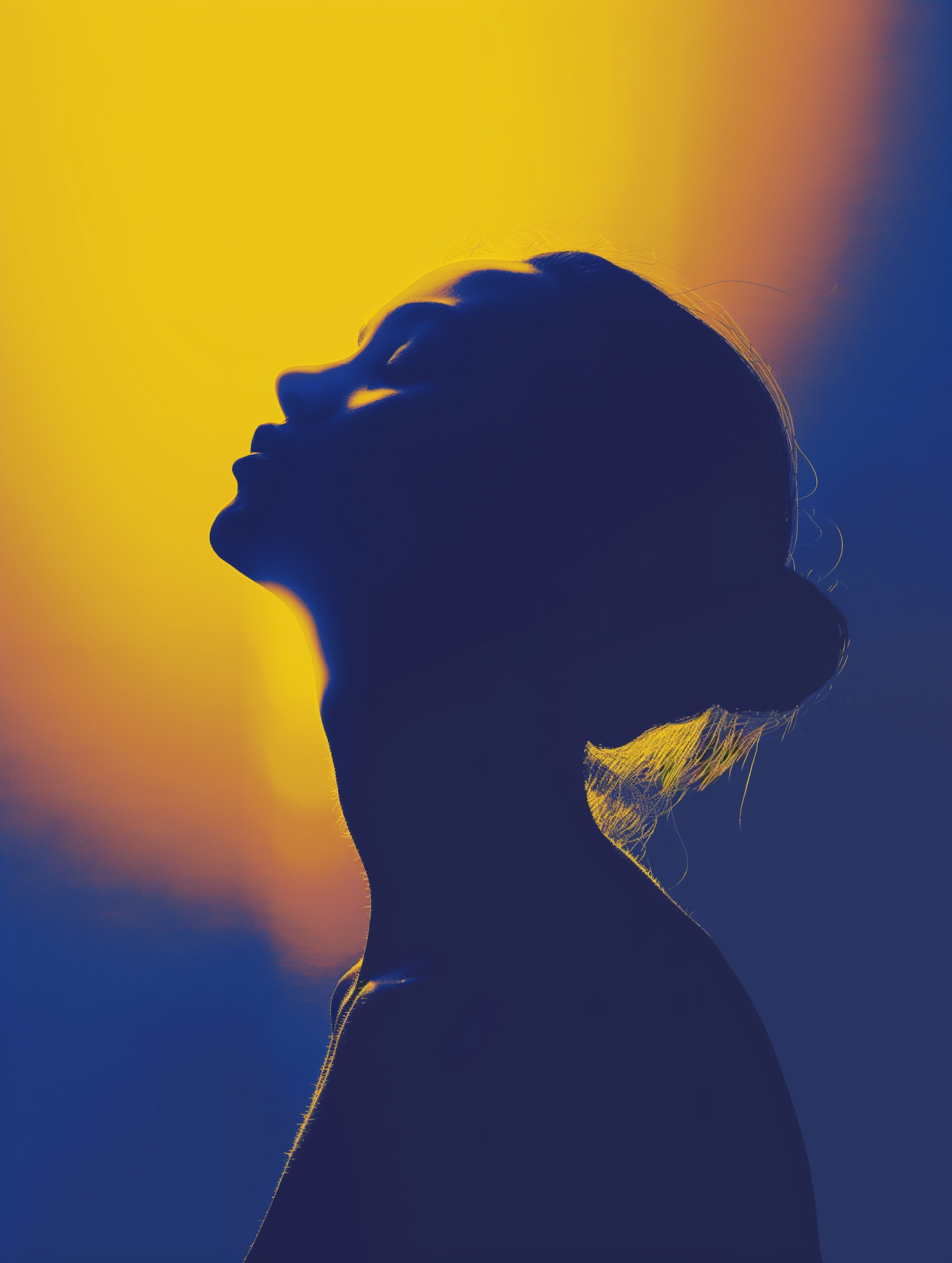 Silhouette of a person against a vibrant yellow and blue gradient background, creating a dramatic and serene visual effect.
