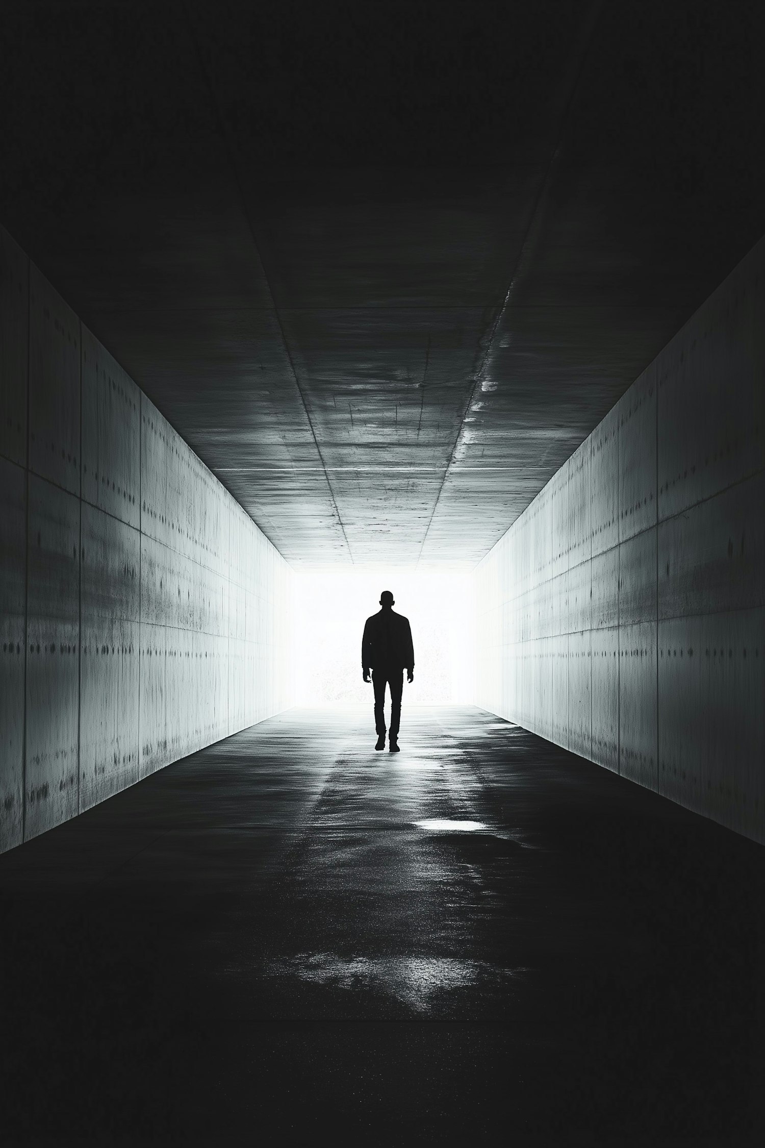 Silhouette of a person walking through a dark tunnel toward a bright light, creating a dramatic and mysterious atmosphere.