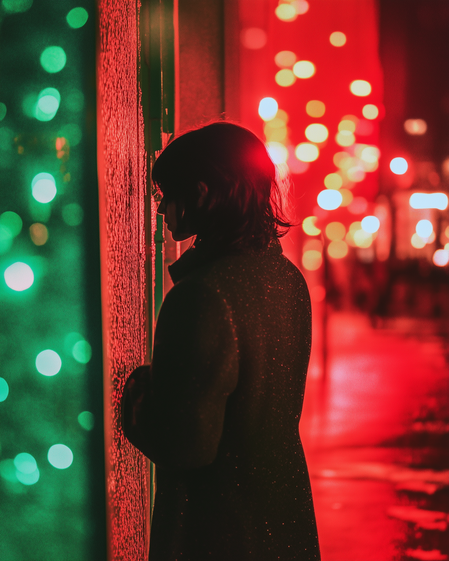 Silhouette of a person against a wall with vibrant red and green lights, creating a festive and atmospheric scene.