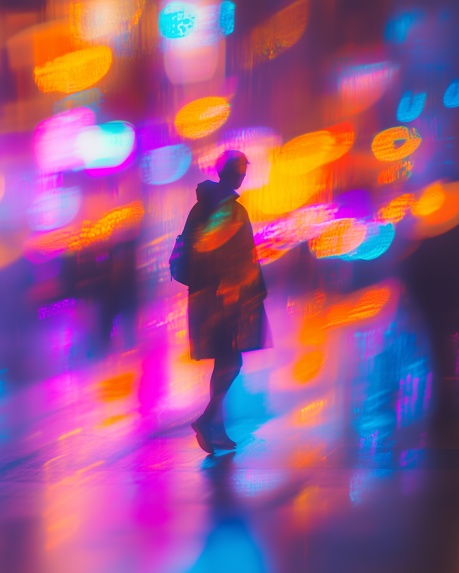 Silhouette of a person against a vibrant, colorful bokeh background, creating a dreamy and mysterious urban night scene.