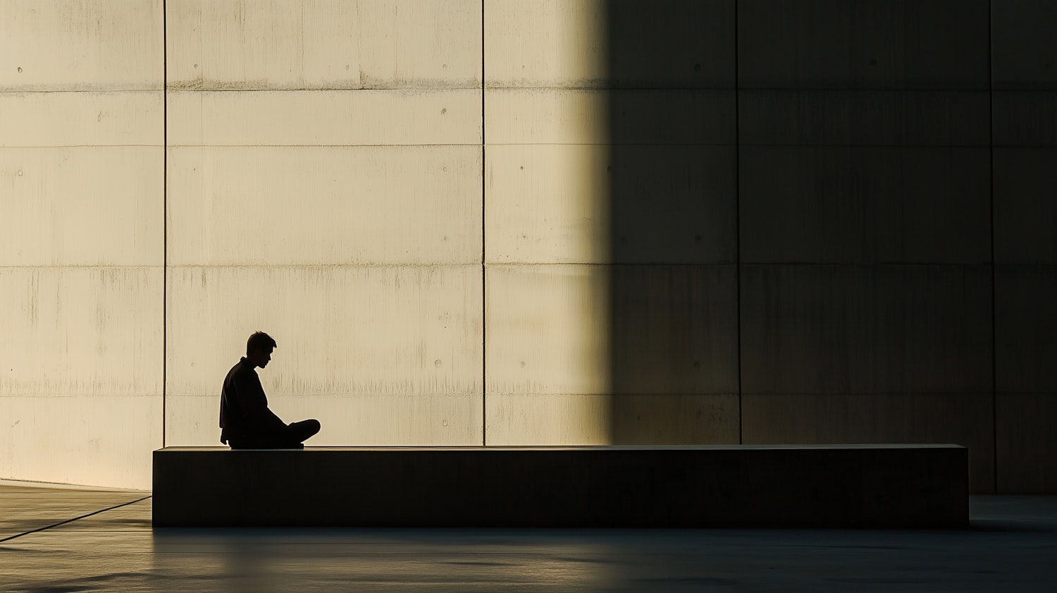 Silhouette of a person sitting cross-legged on a bench against a sunlit concrete wall, creating a serene and minimalistic atmosphere.