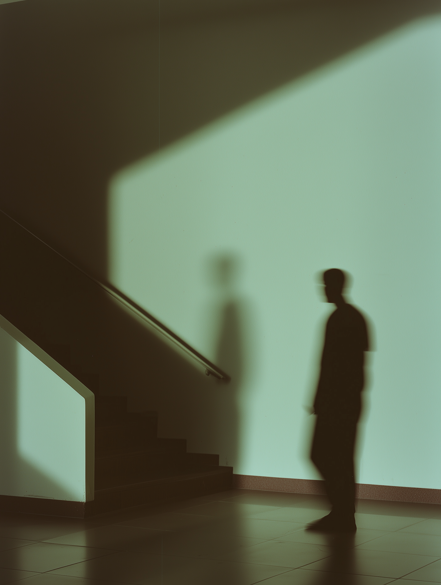 Shadowy figure in a dim hallway with green walls and tiled floor, casting a long shadow near a staircase.