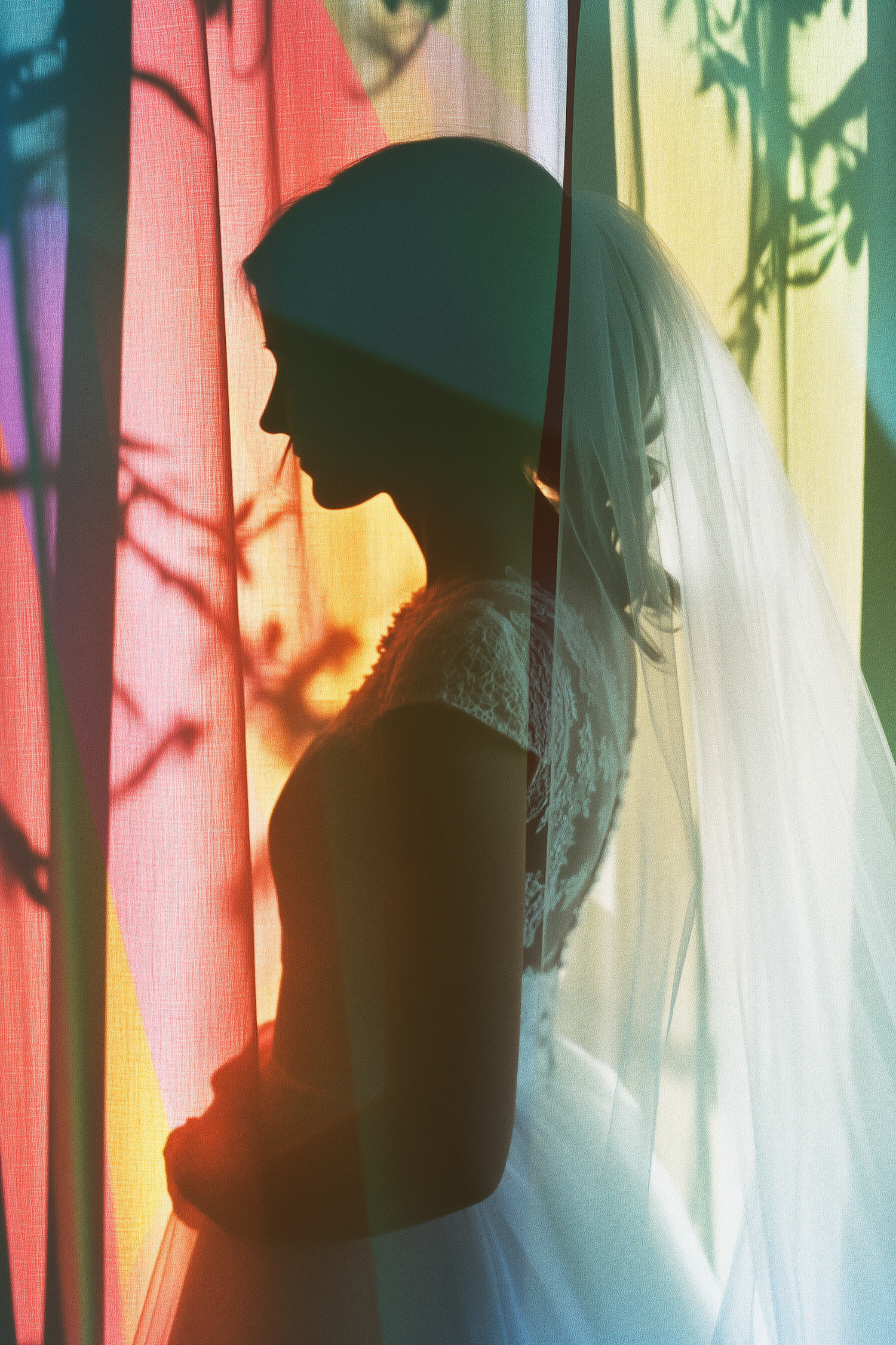 Silhouette of a bride against colorful curtains, with lace details and a veil, creating a serene and artistic atmosphere.