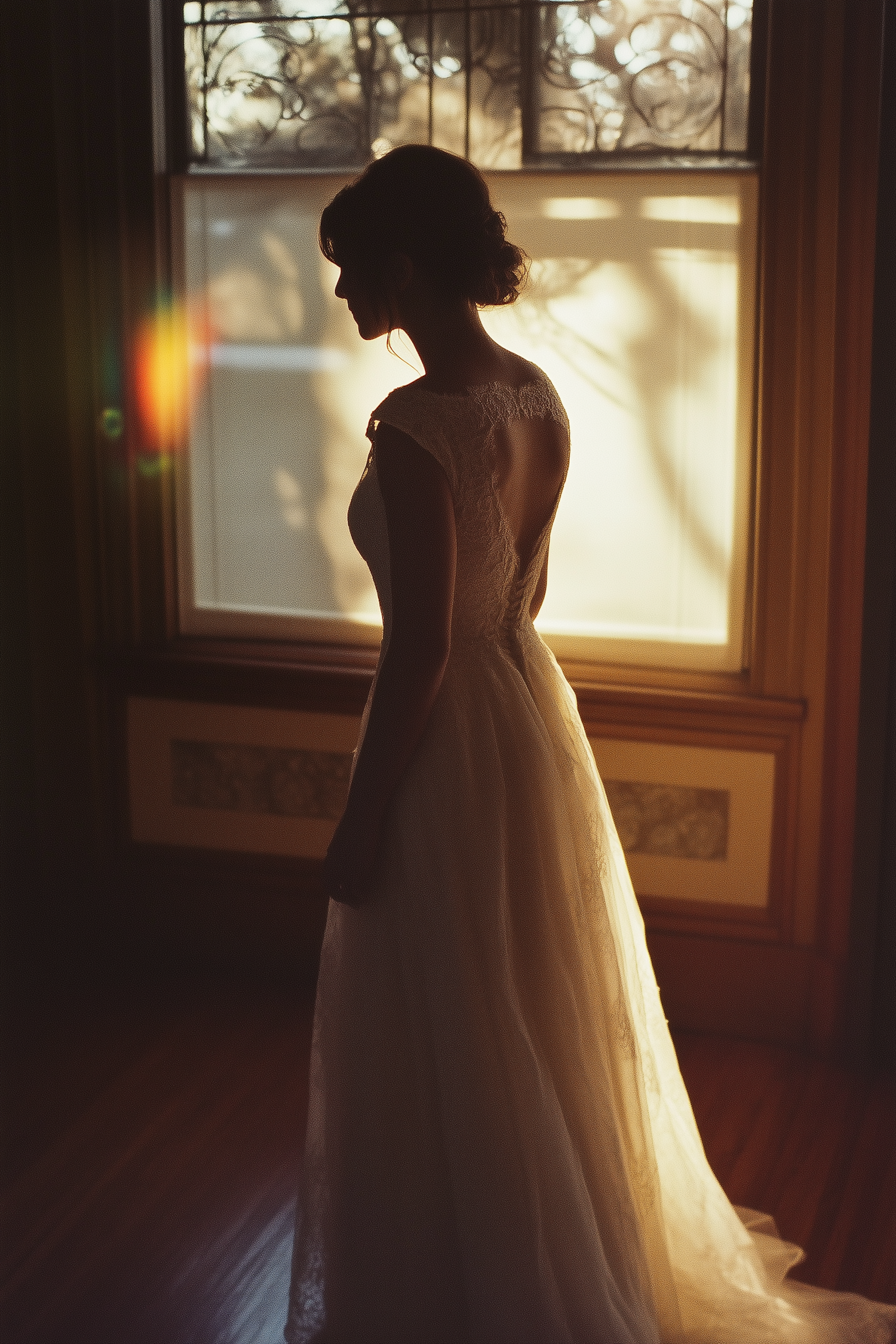 Silhouetted bride in lace gown stands by a window, bathed in warm, golden light, creating an intimate and elegant atmosphere.