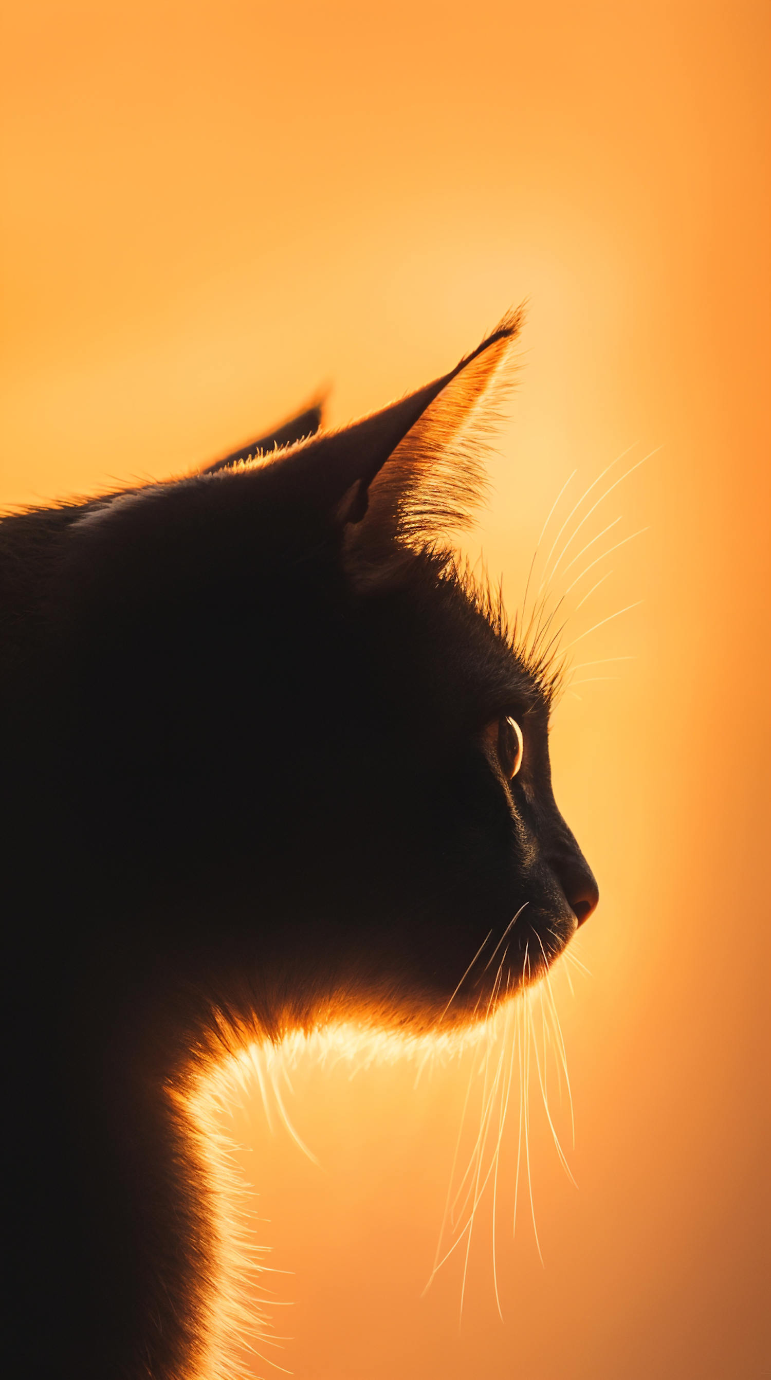 Silhouette of a cat against a vibrant orange sunset, highlighting its whiskers and fur with a warm glow.