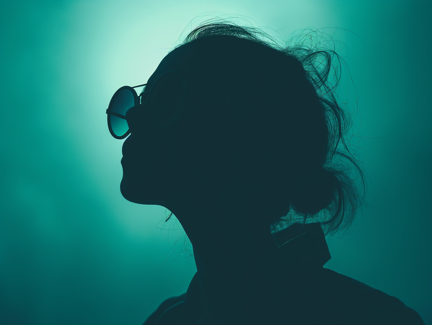 Silhouette of a person with sunglasses against a teal background, creating a calm and introspective mood.