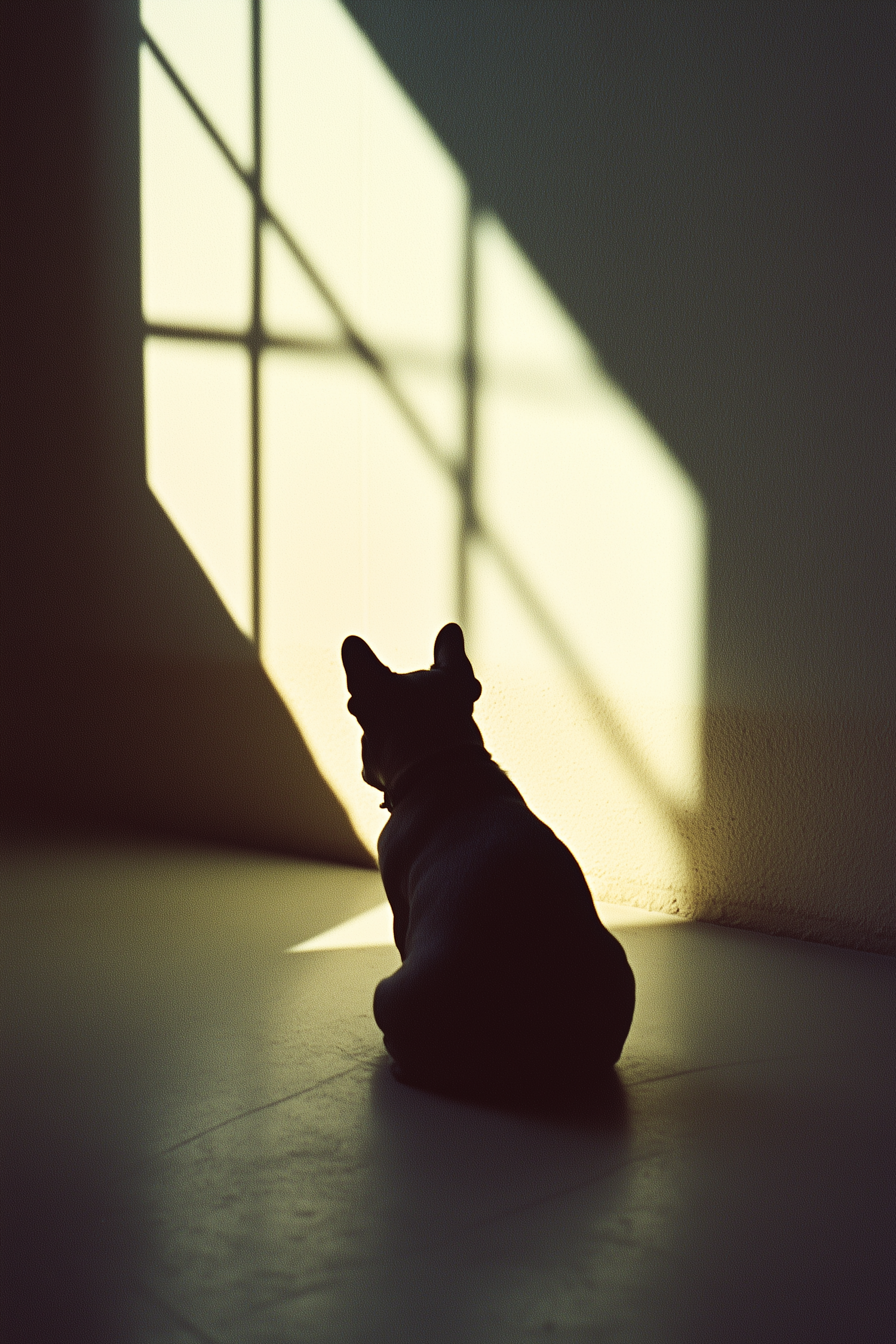 Silhouette of a French Bulldog sitting in sunlight, casting geometric shadows on a wall, creating a serene and contemplative scene.