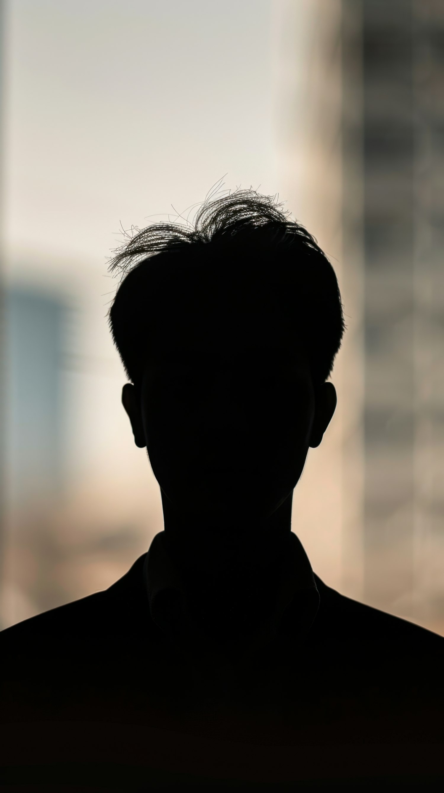 Silhouette of a person with short hair against a blurred, light gradient background, creating a mysterious and dramatic effect.