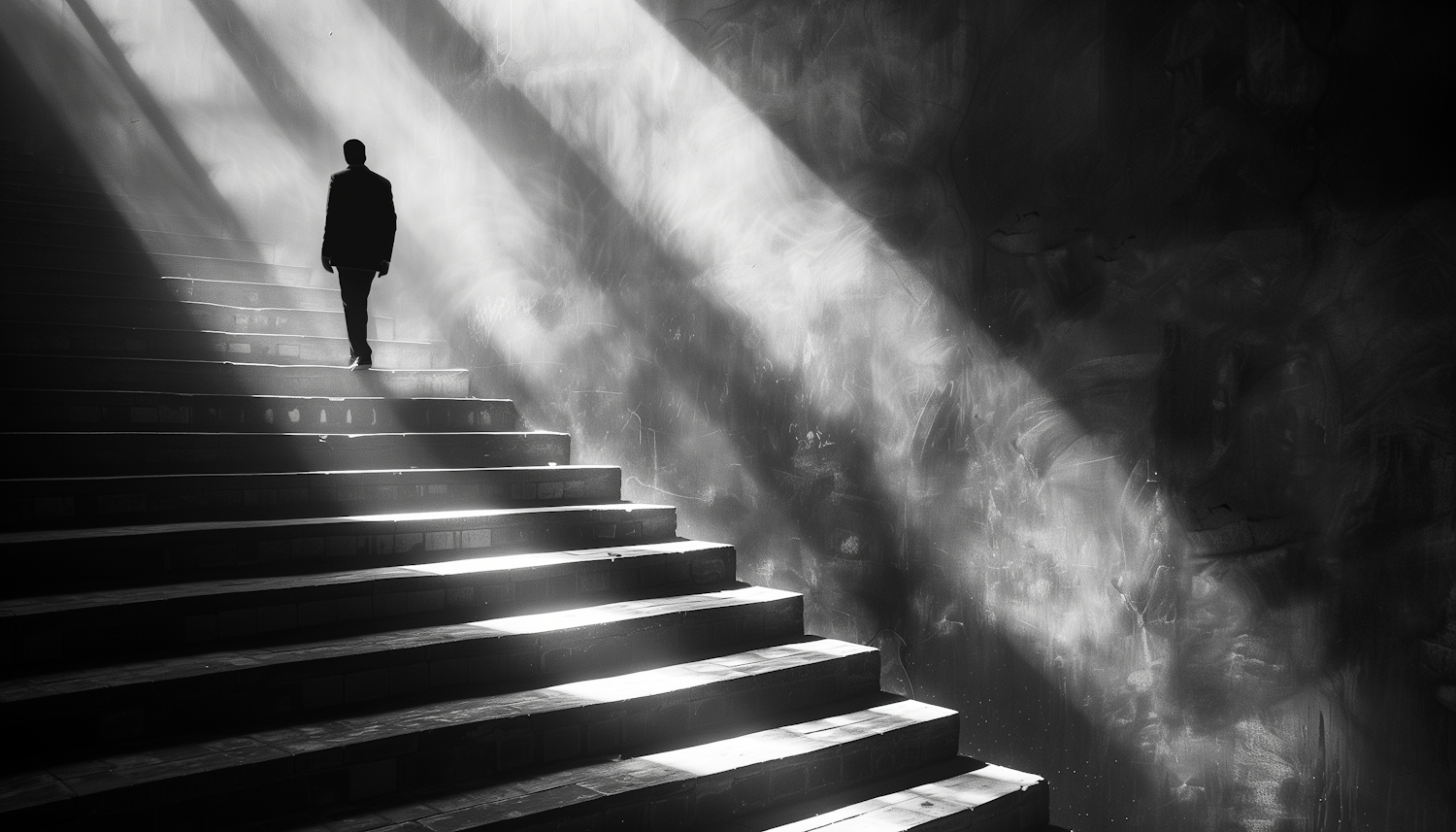 A silhouetted figure ascends shadowy stairs, bathed in dramatic light beams, creating a mysterious and introspective atmosphere.