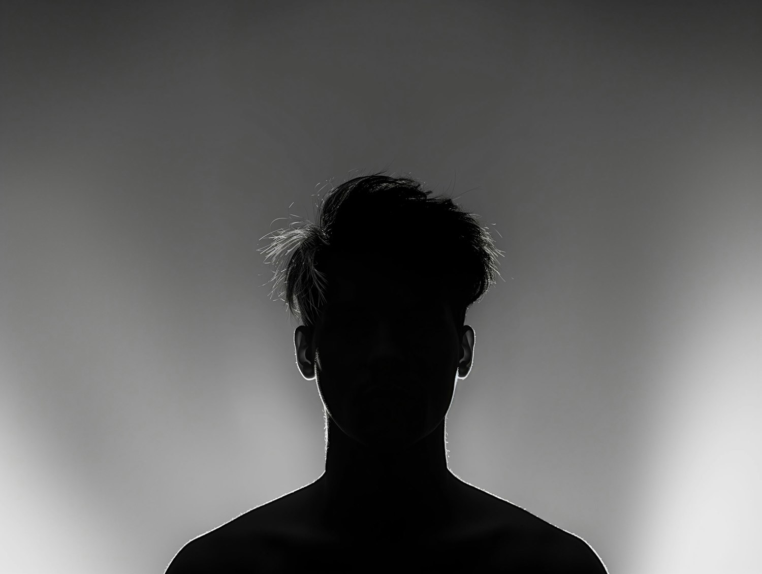 Silhouette of a person with tousled hair against a bright, backlit background, creating a dramatic and mysterious effect.