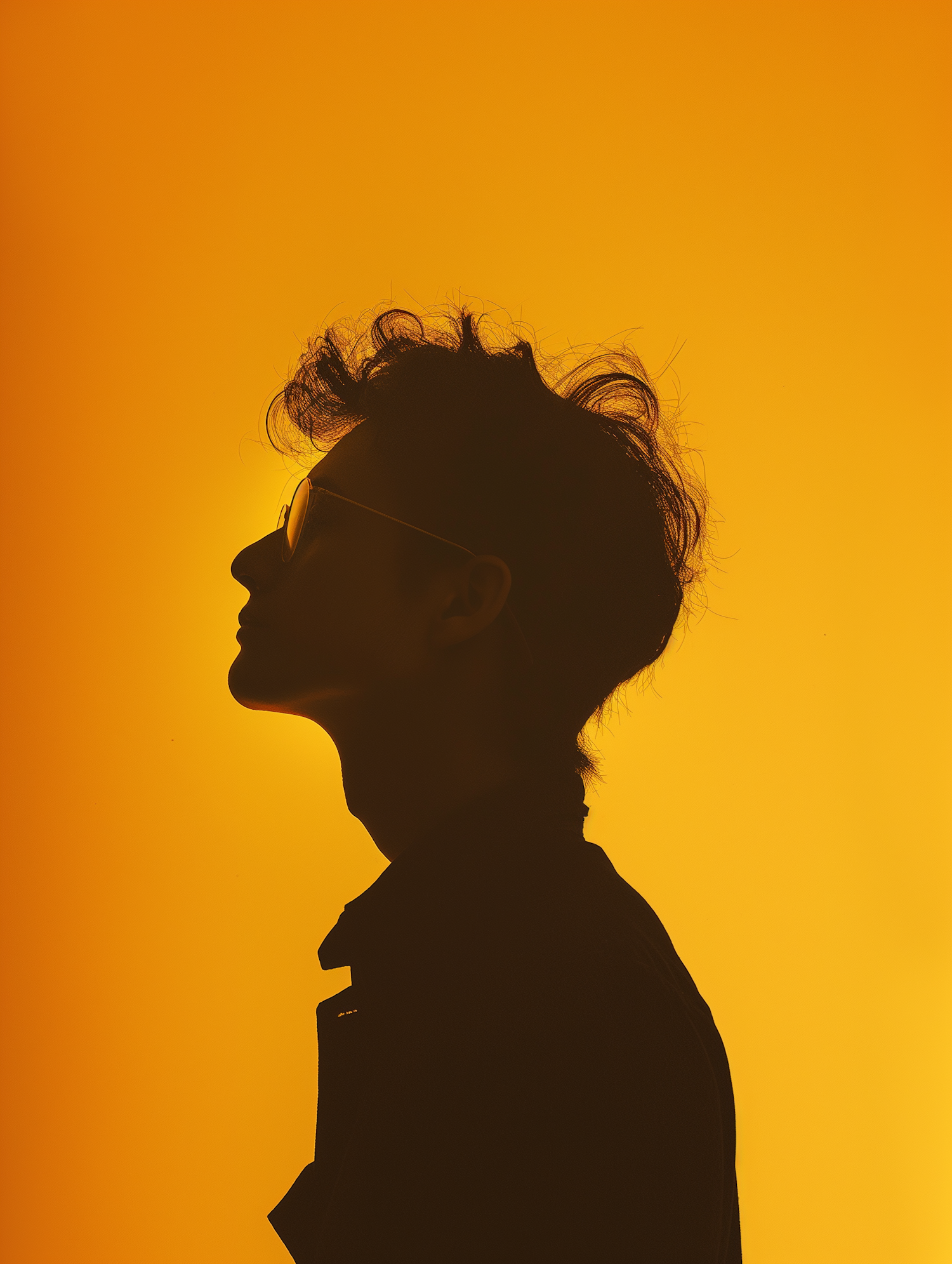Silhouette of a person with glasses against a vibrant orange background, creating a striking visual contrast.