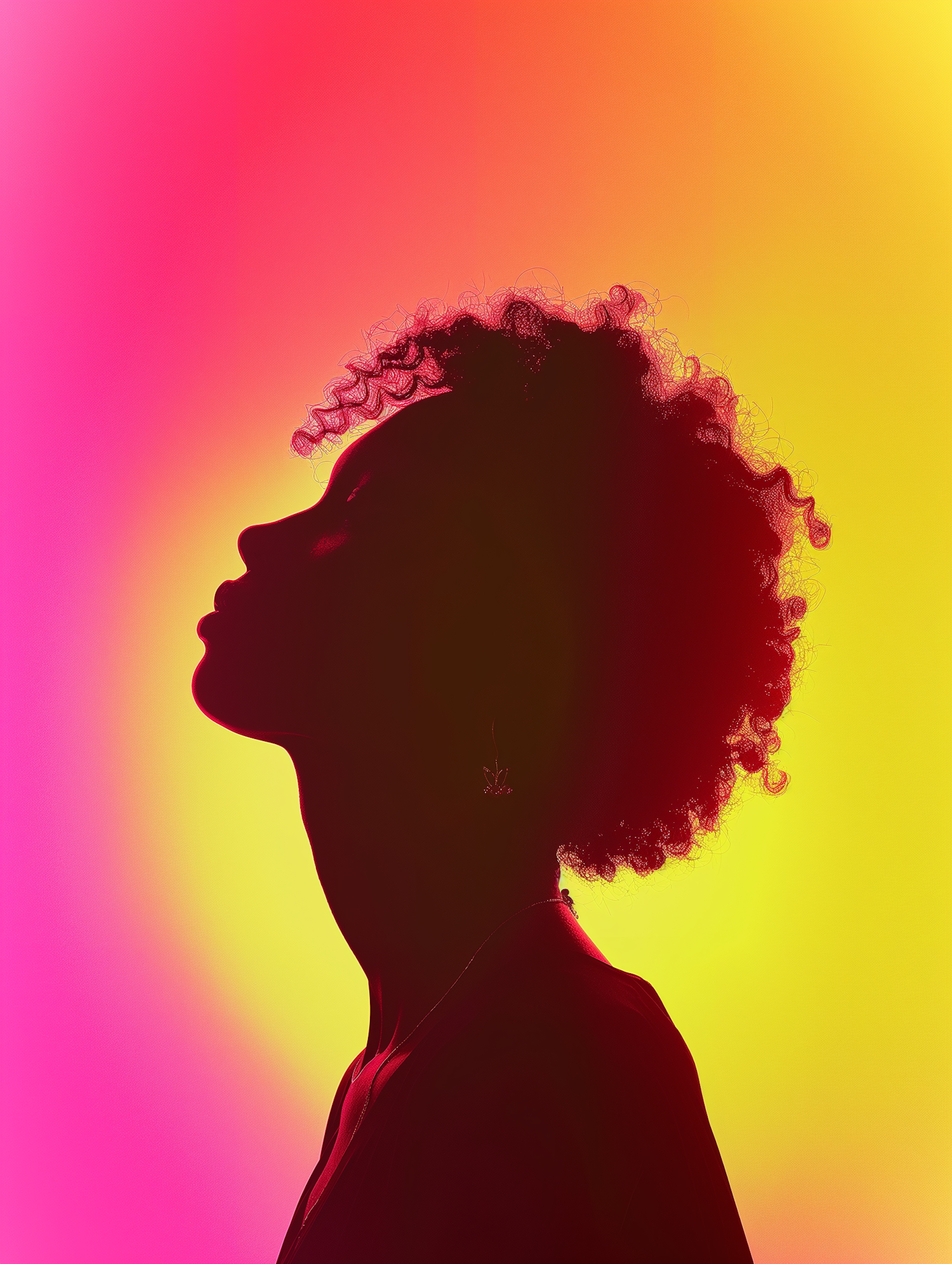 Silhouette of a person with curly hair against a vibrant pink and yellow gradient background, creating a striking visual contrast.