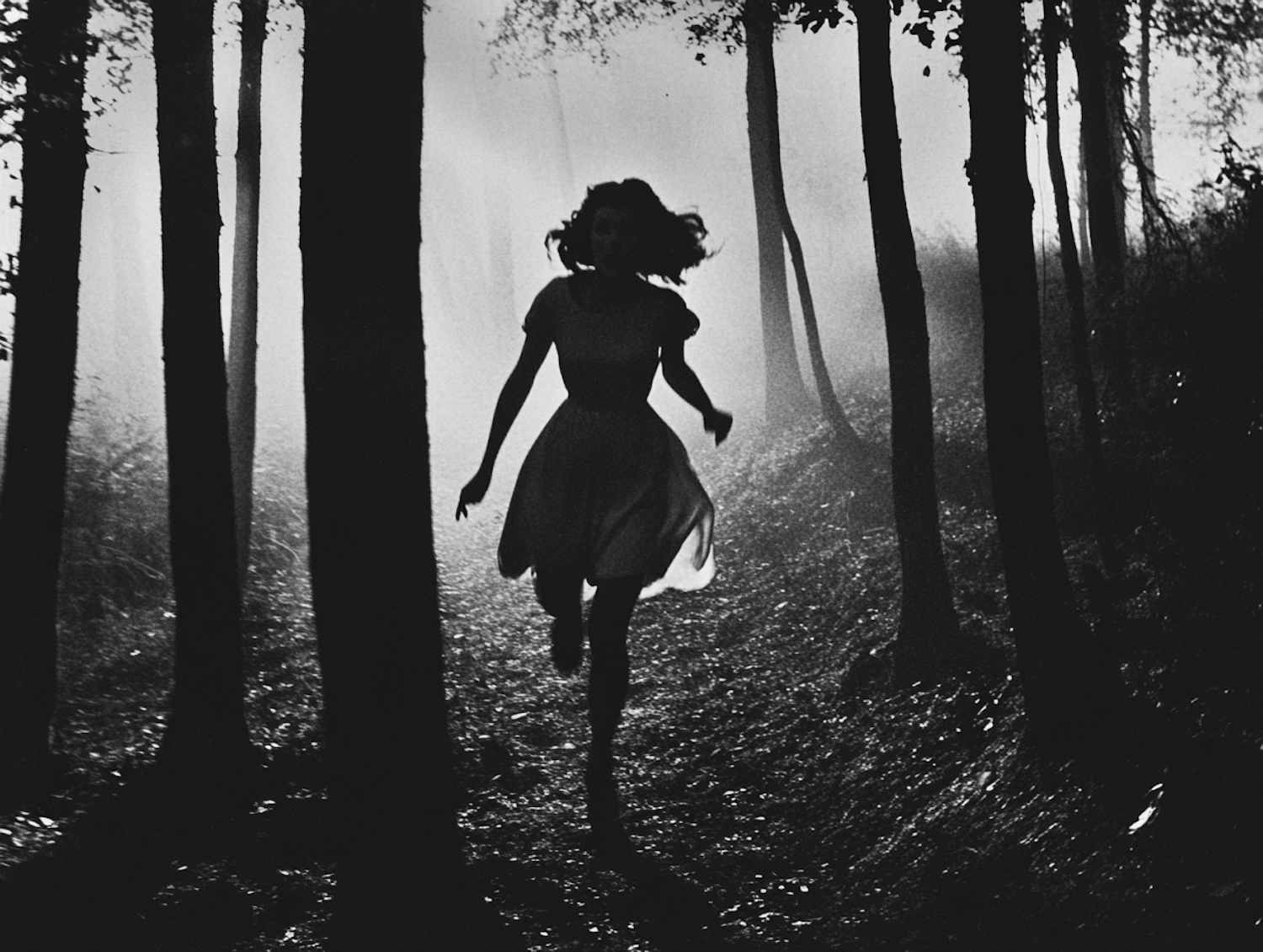 Silhouette of a woman running through a misty forest, creating a dramatic and mysterious atmosphere.