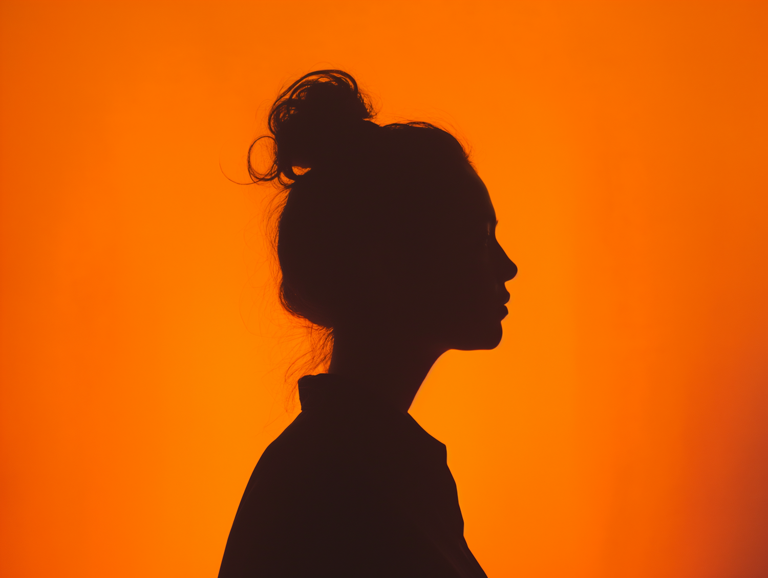 Silhouette of a person with a bun against a vibrant orange background, creating a striking contrast and elegant profile.