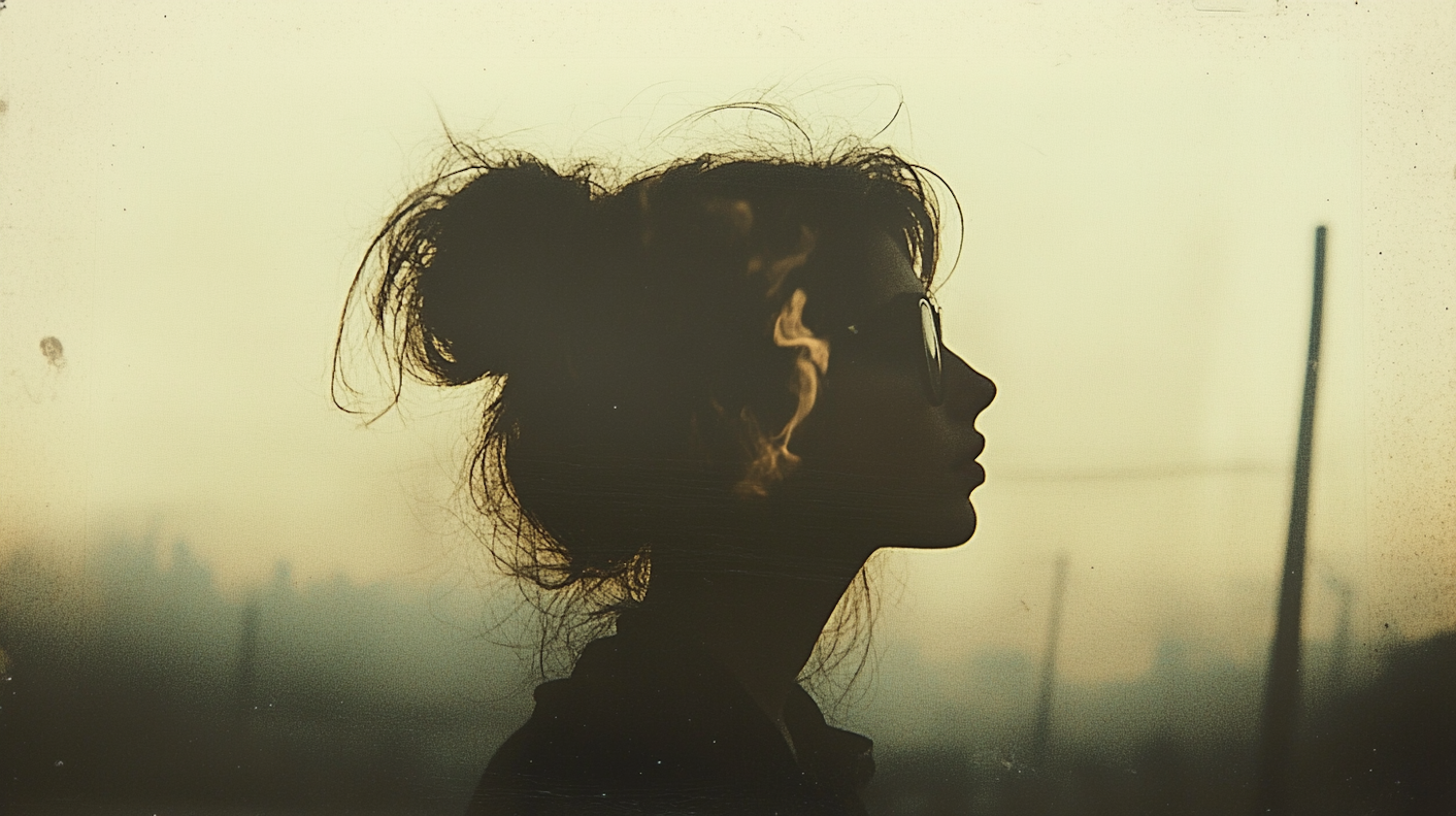 Silhouette of a person with a messy bun and glasses against a warm, hazy background, creating a serene and contemplative mood.