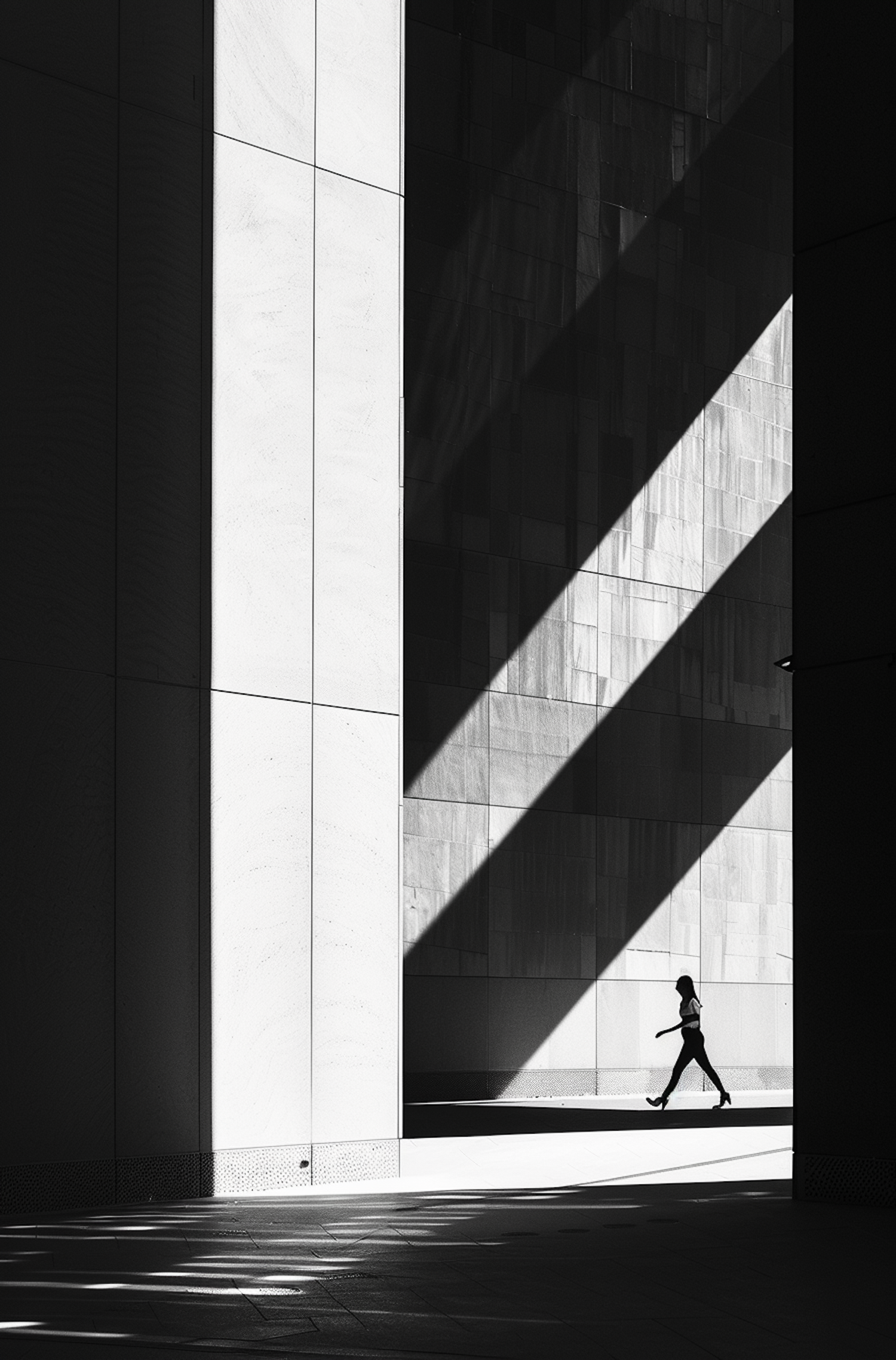Minimalist black-and-white photo of a lone figure walking through dramatic light and shadow in an urban architectural setting.