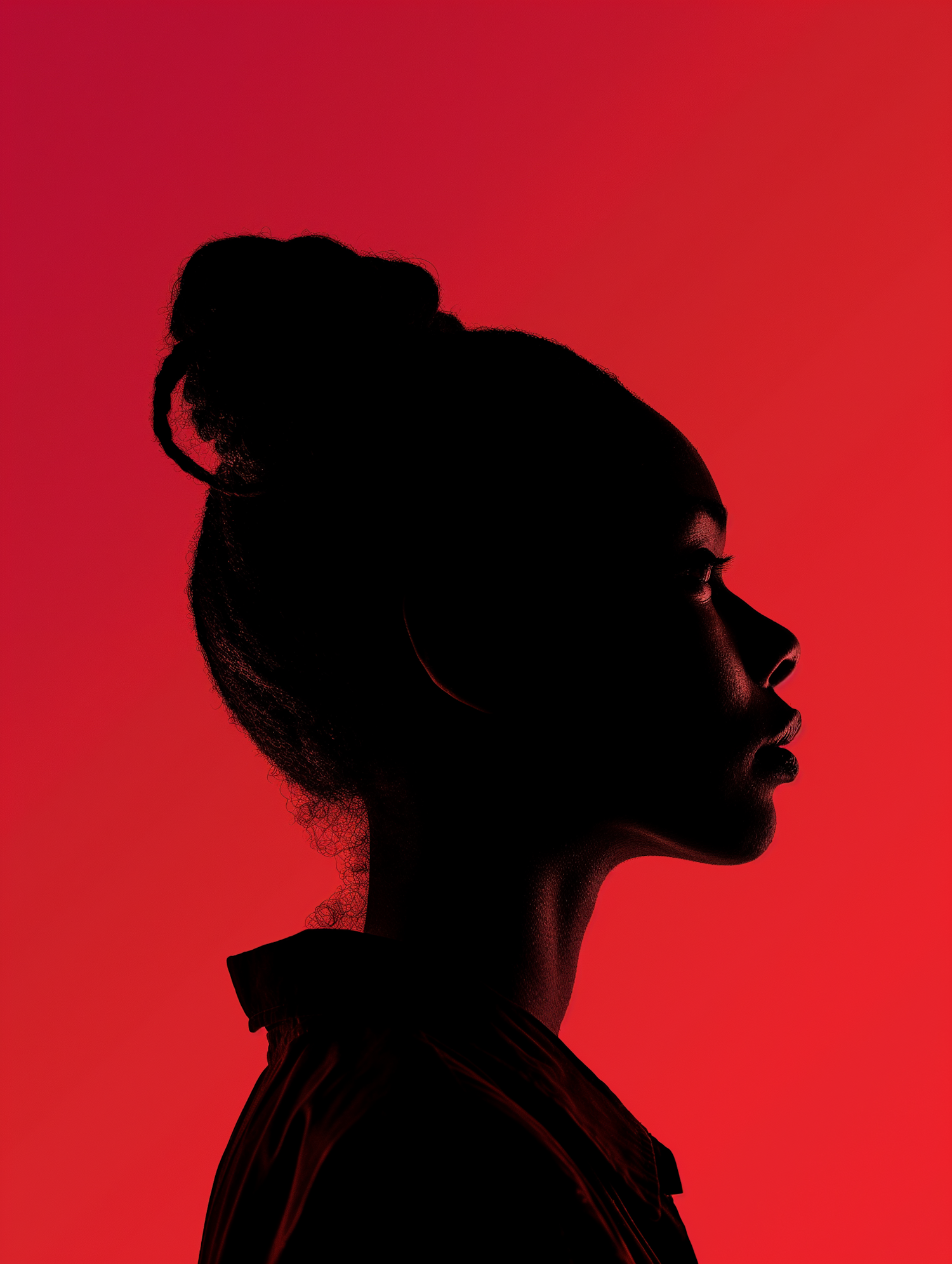 Silhouette of a person with a bun against a vibrant red background, creating a striking contrast and dramatic profile.