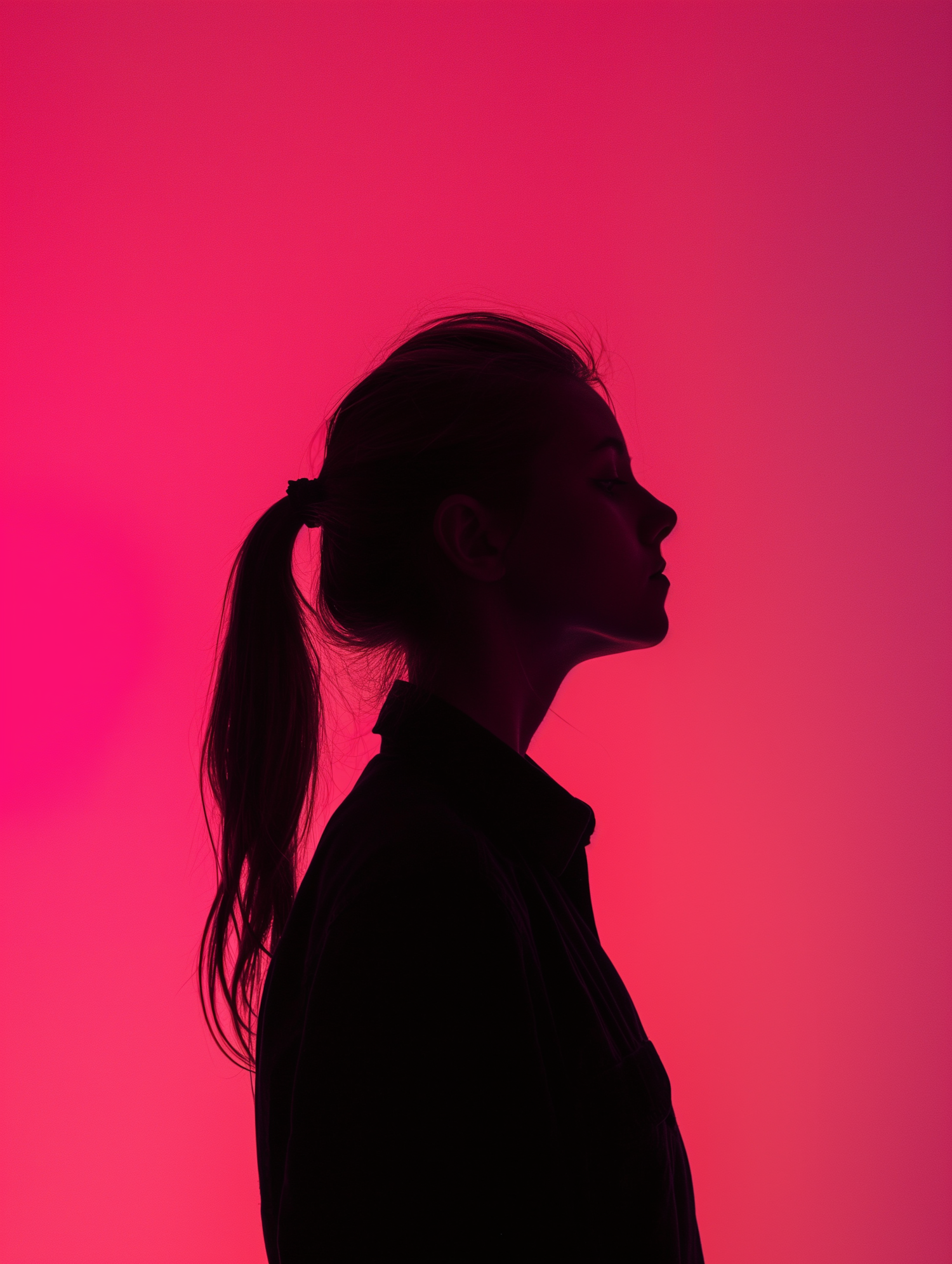 Silhouette of a person with a ponytail against a vibrant pink gradient background, creating a striking contrast.