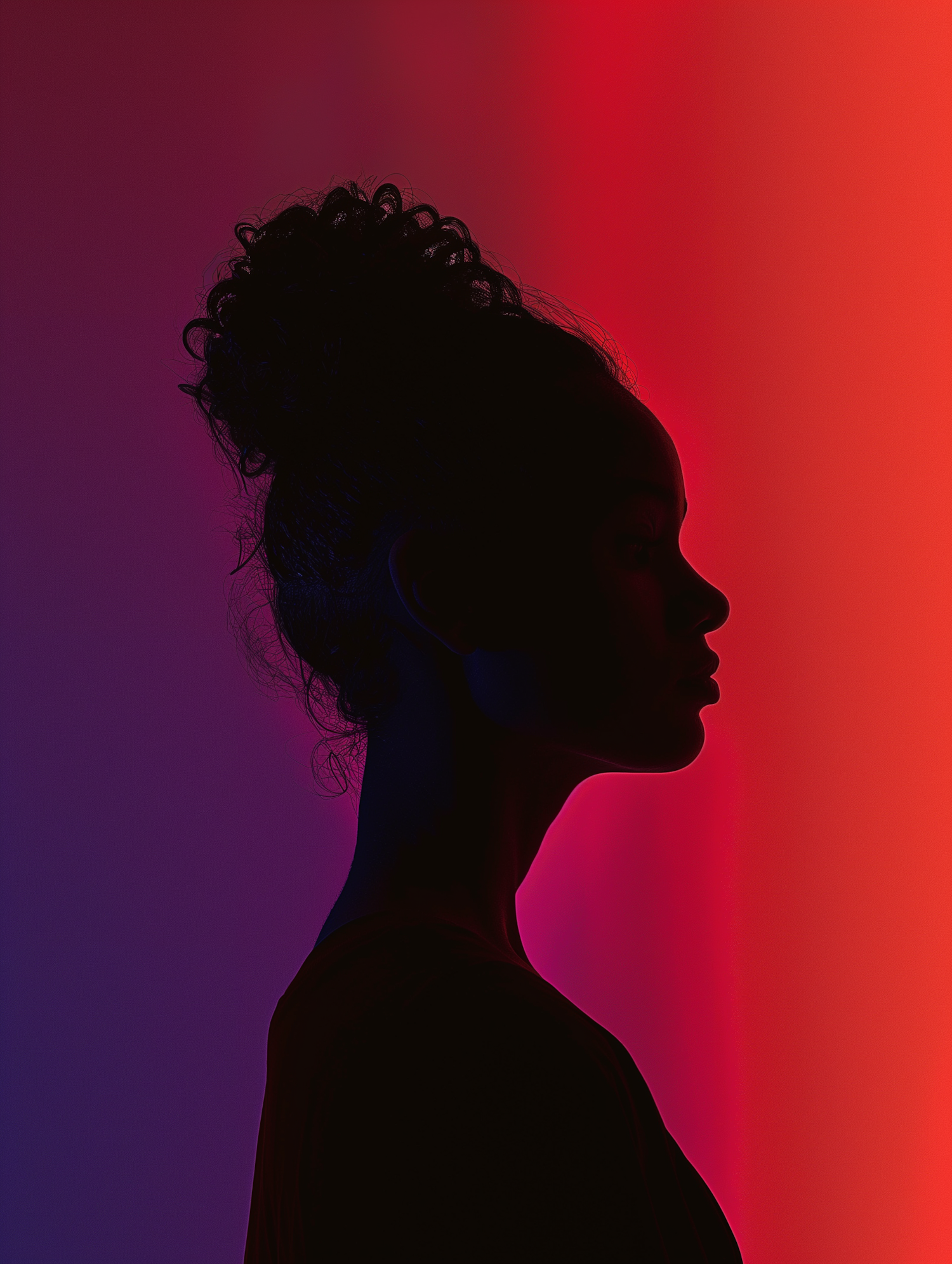 Silhouette of a person with curly hair against a vibrant purple to red gradient background.