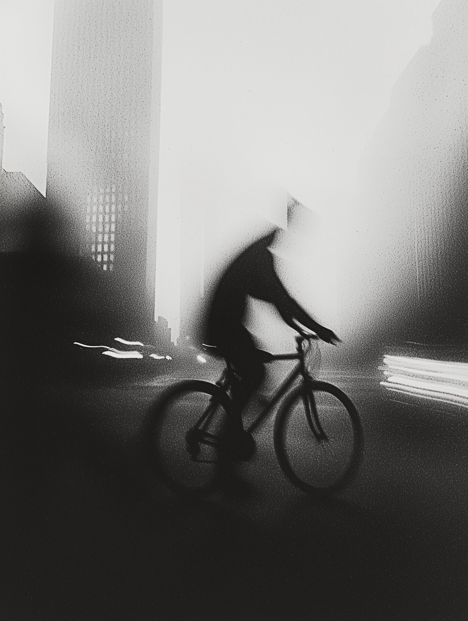 Blurred monochrome image of a cyclist in motion against a bright cityscape, creating a dynamic and ghostly effect.