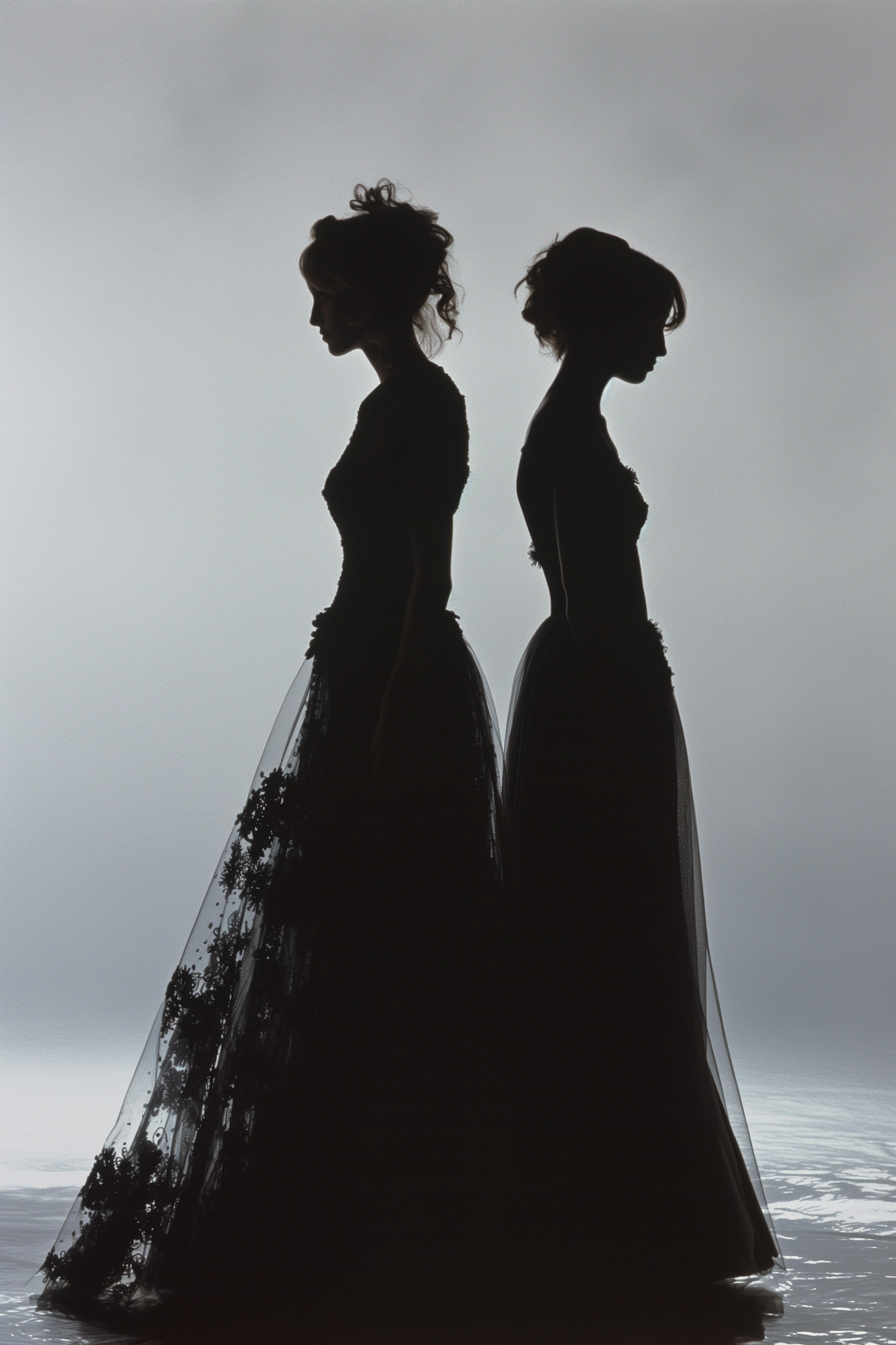 Silhouetted women in elegant gowns stand back-to-back against a misty background, creating a mysterious and graceful scene.