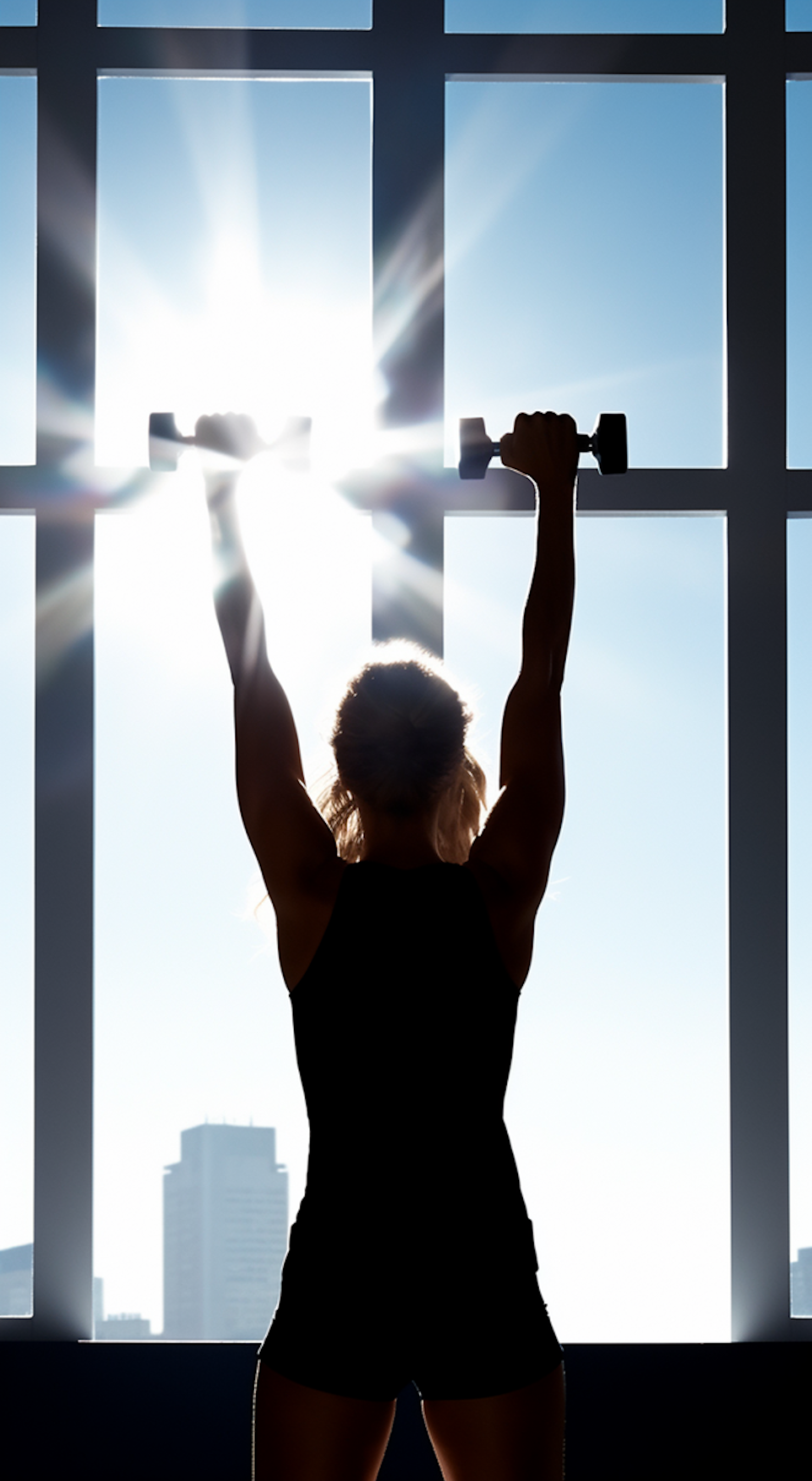 Silhouette of a person lifting dumbbells in front of a sunlit window, with a cityscape in the background.