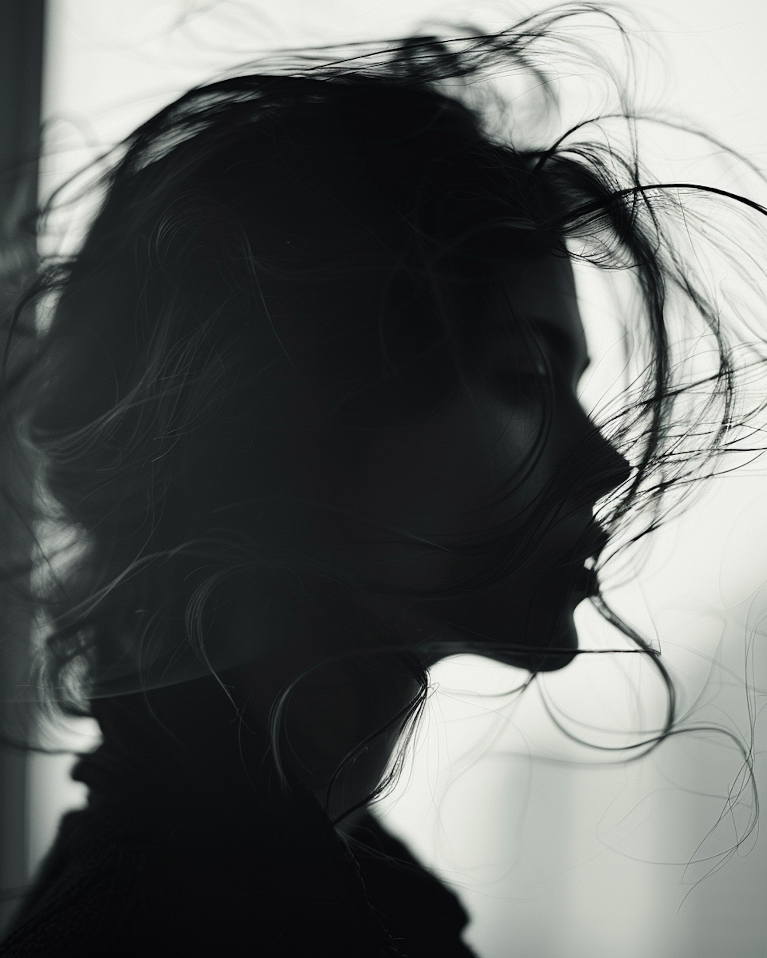Artistic silhouette of a person with flowing hair in profile, set against a softly lit background, creating a dramatic monochrome effect.