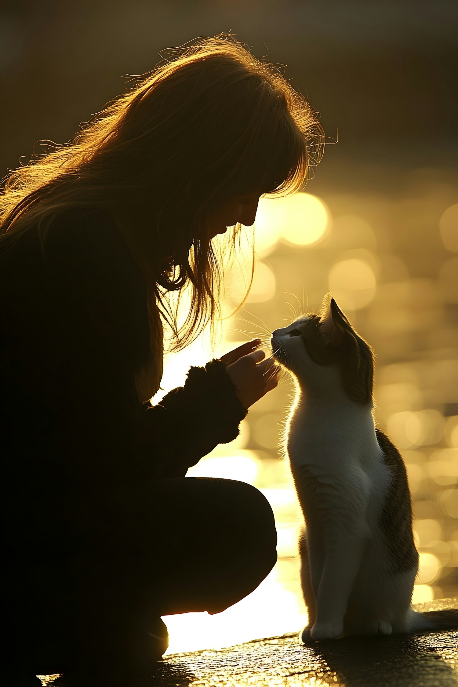 Silhouette of a person and cat at sunset, creating a serene and warm atmosphere with golden reflections on water.