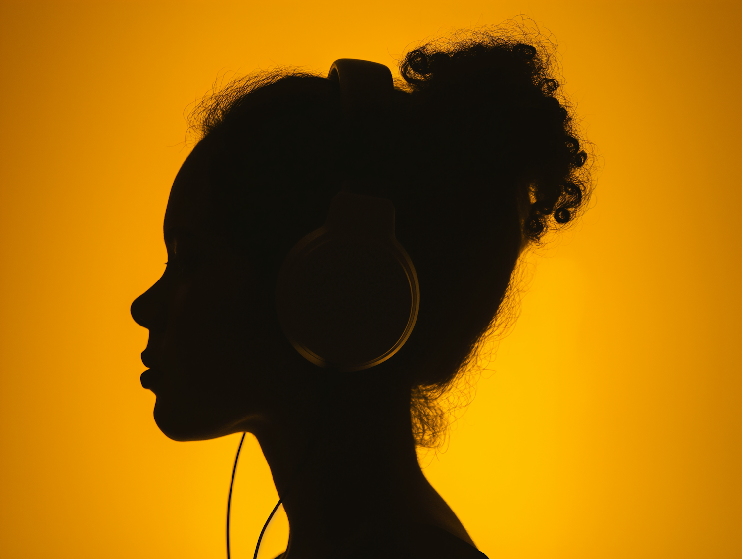 Silhouette of a person with headphones against a vibrant yellow background, highlighting a serene listening moment.