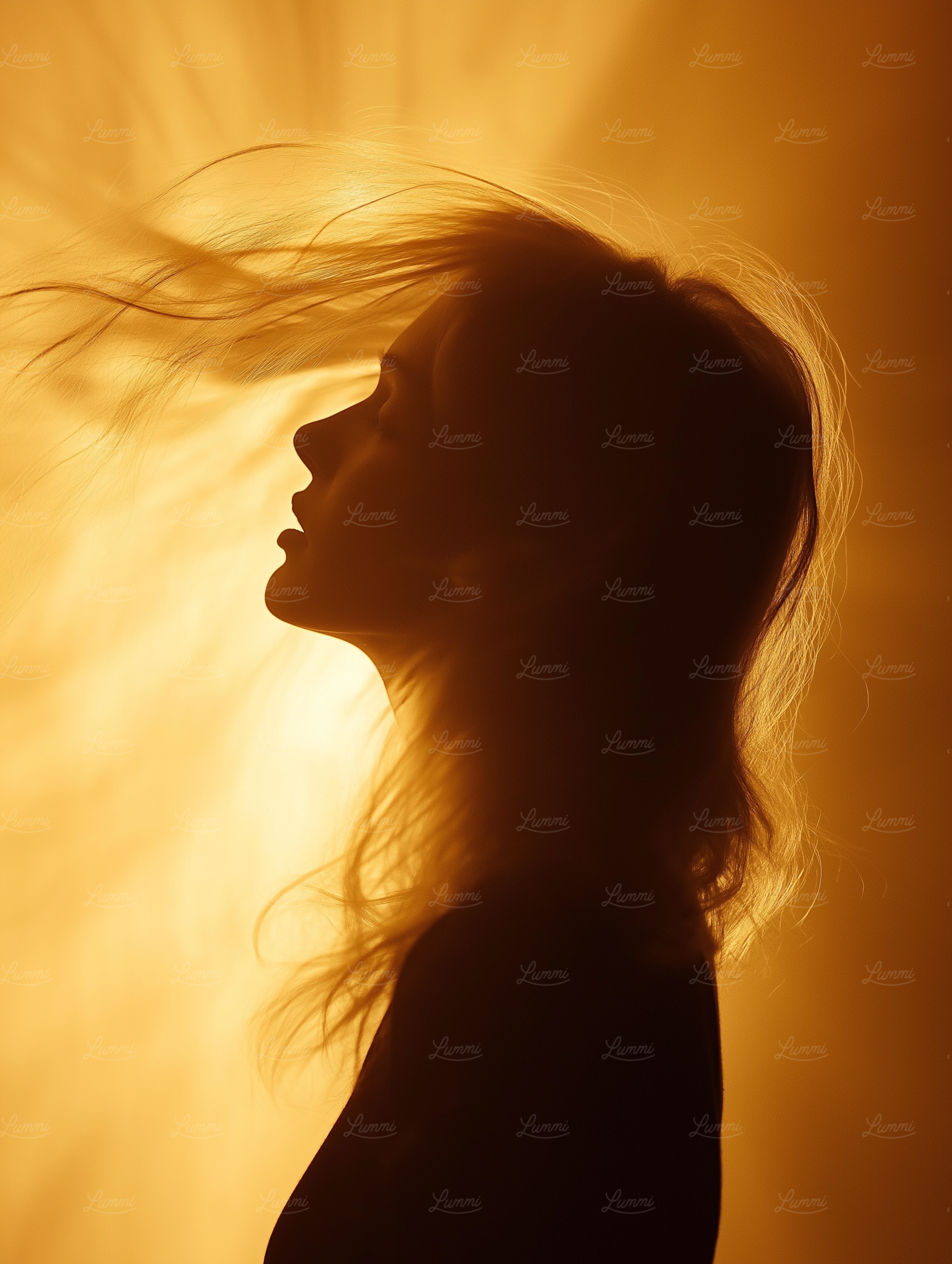Silhouette of a woman with flowing hair against a golden background, creating an ethereal and serene atmosphere.