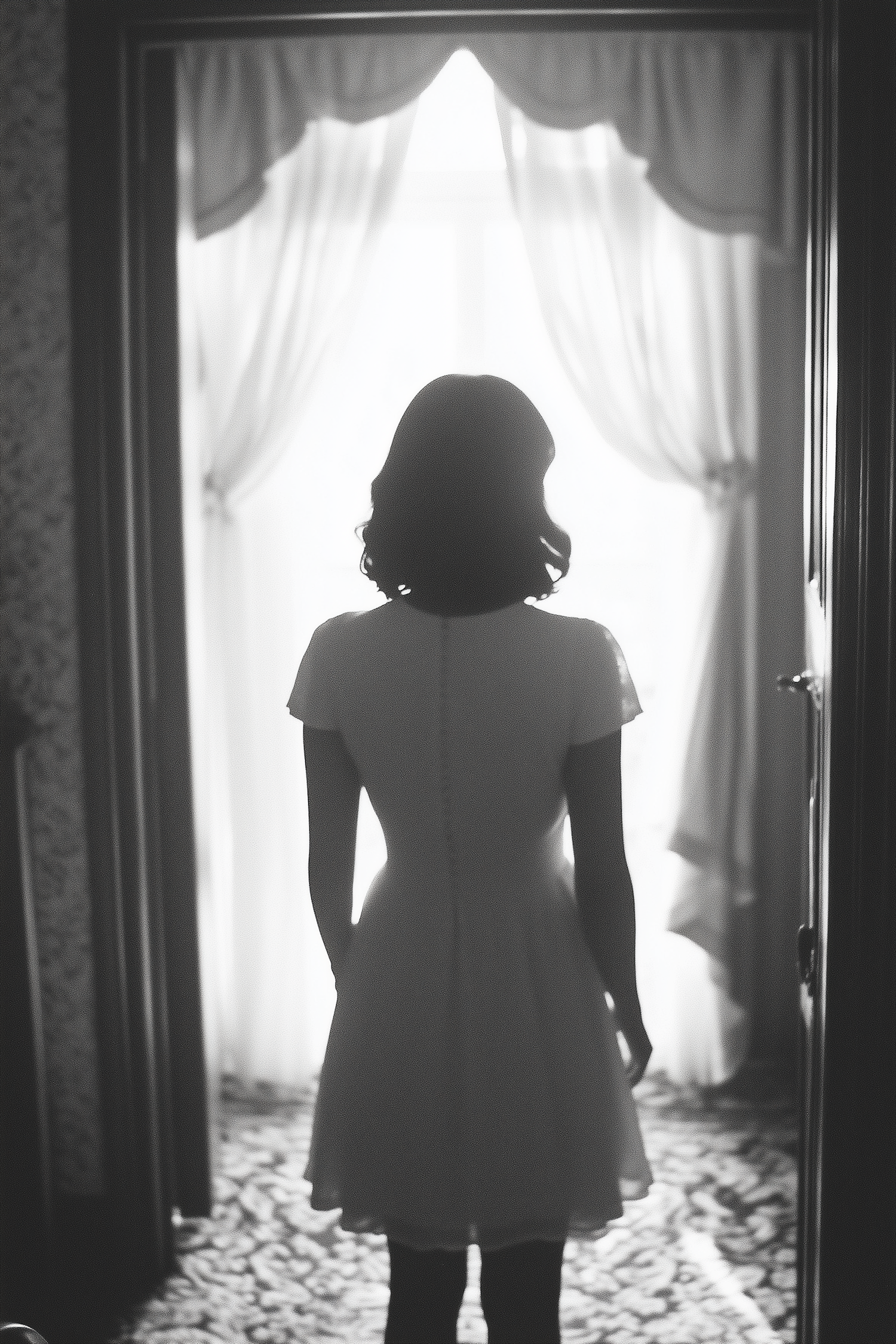 Silhouette of a woman in a dress standing in a doorway, backlit by a bright window with sheer curtains, creating a serene atmosphere.