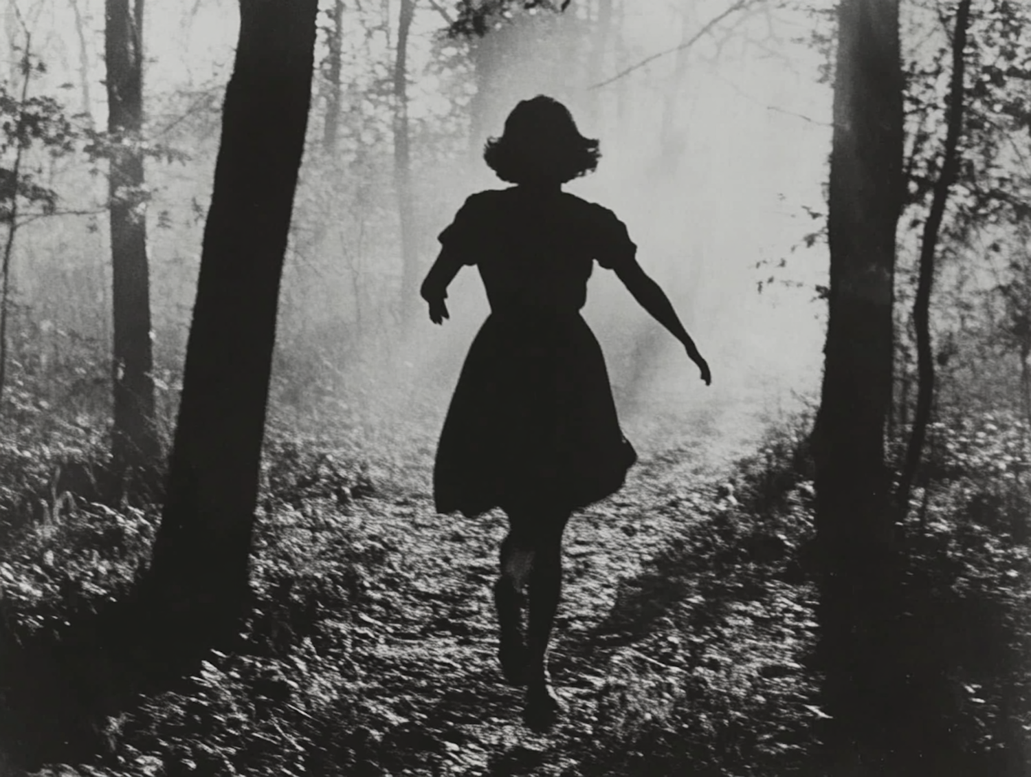 Silhouette of a woman running through a misty forest, creating an eerie and mysterious atmosphere in black and white.