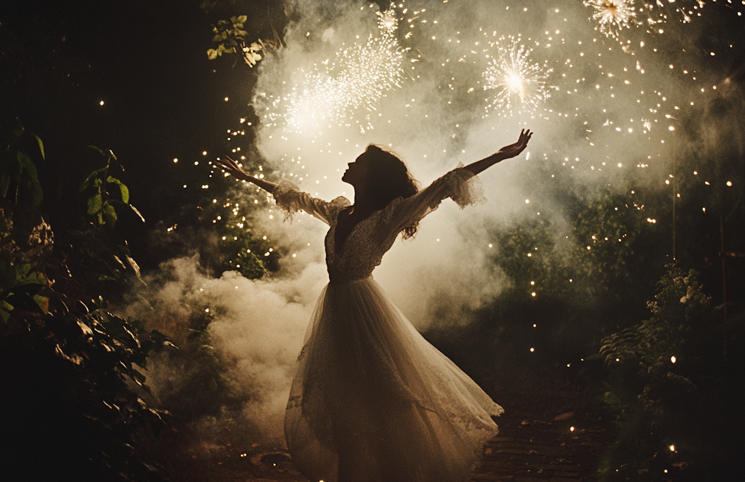 Silhouetted woman in a white dress with fireworks in the background, creating a magical and enchanting atmosphere.
