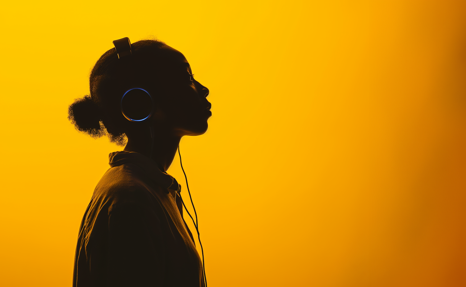Silhouette of a person with headphones against a vibrant yellow background, creating a striking contrast.