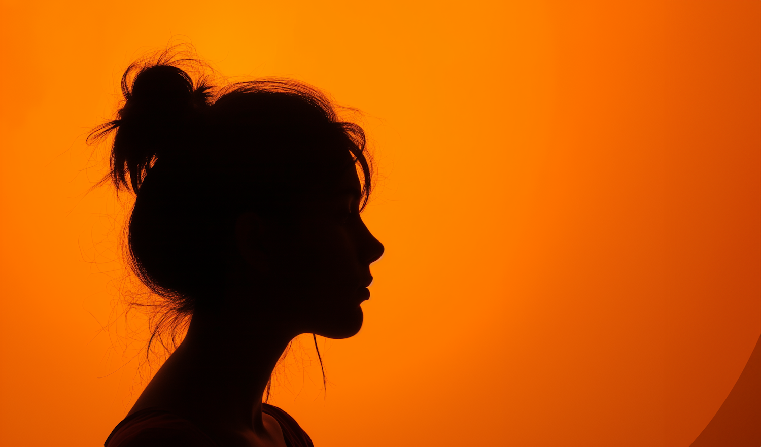 Silhouette of a person with a bun against a vibrant orange background, highlighting facial contours and stray hairs.