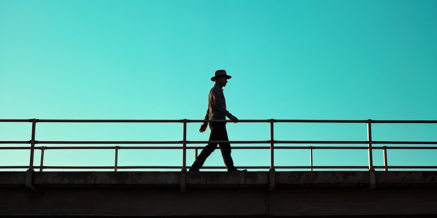 A person walks on a bridge silhouetted against a vibrant turquoise sky, creating a serene and minimalist scene.