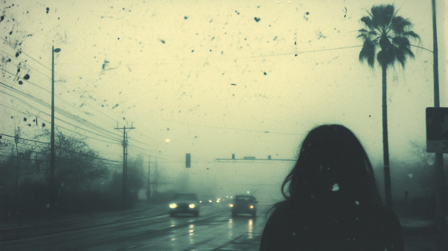 Silhouette on a misty road with cars and palm tree, enveloped in a greenish hue. Atmospheric and moody scene with vintage texture.
