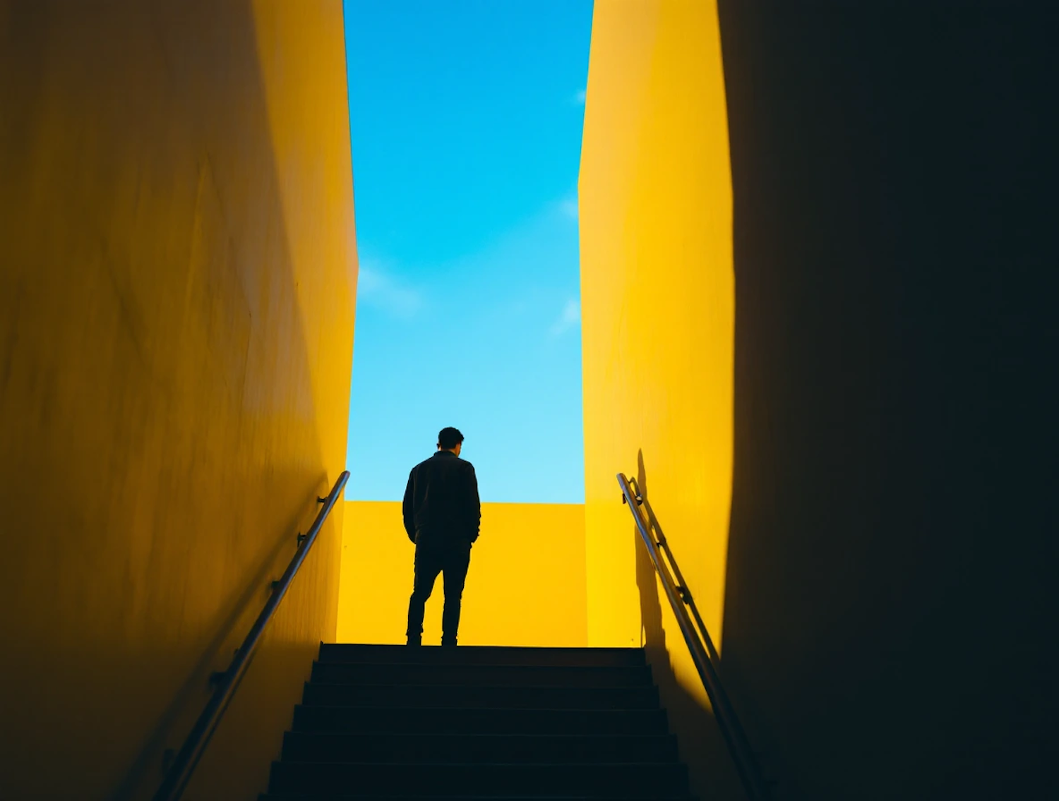 Silhouette of a person on stairs between bright yellow walls under a clear blue sky, creating a dramatic contrast.