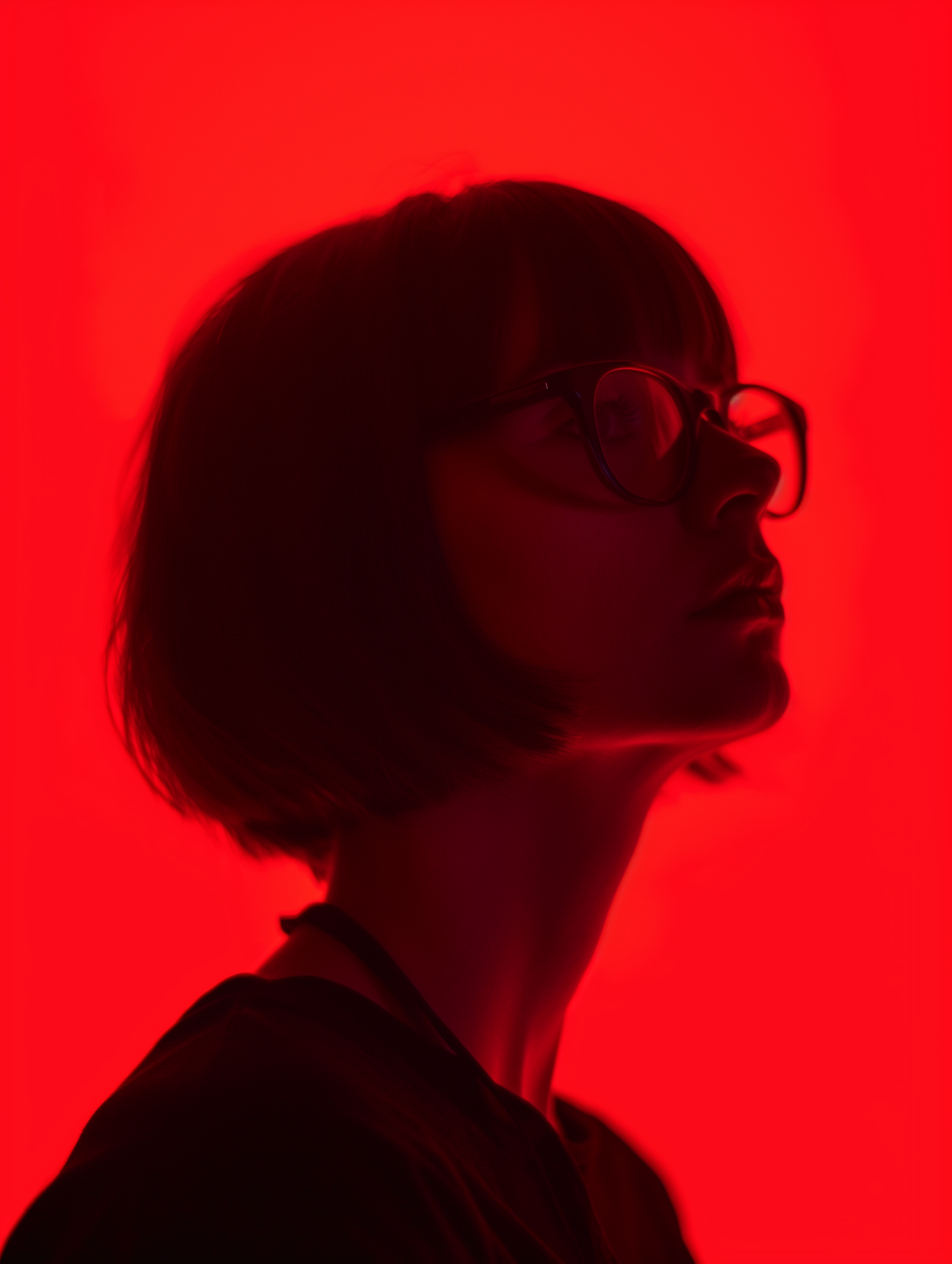 Silhouette of a person with glasses against a vivid red background, creating a dramatic and striking visual effect.