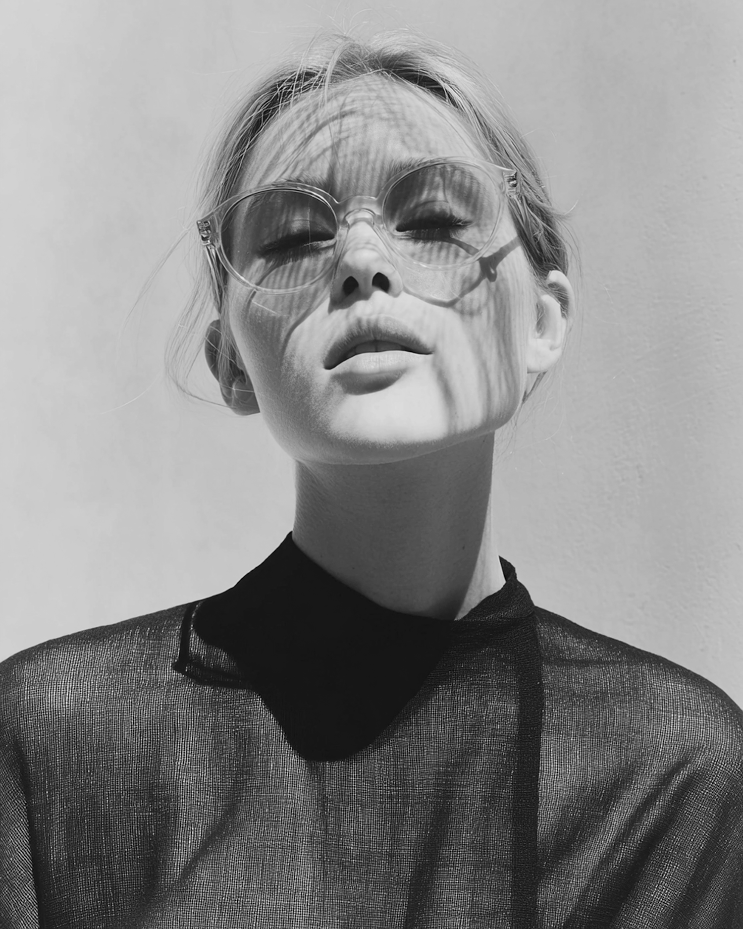 Monochrome image of a person in sunglasses, textured top, and patterned shadows on face; minimalist artistic style.