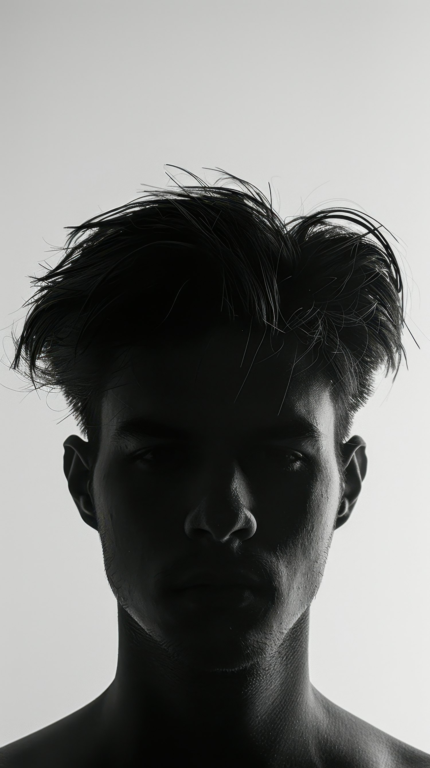 Silhouette of a young man with tousled hair, creating a dramatic and artistic contrast against a light background.