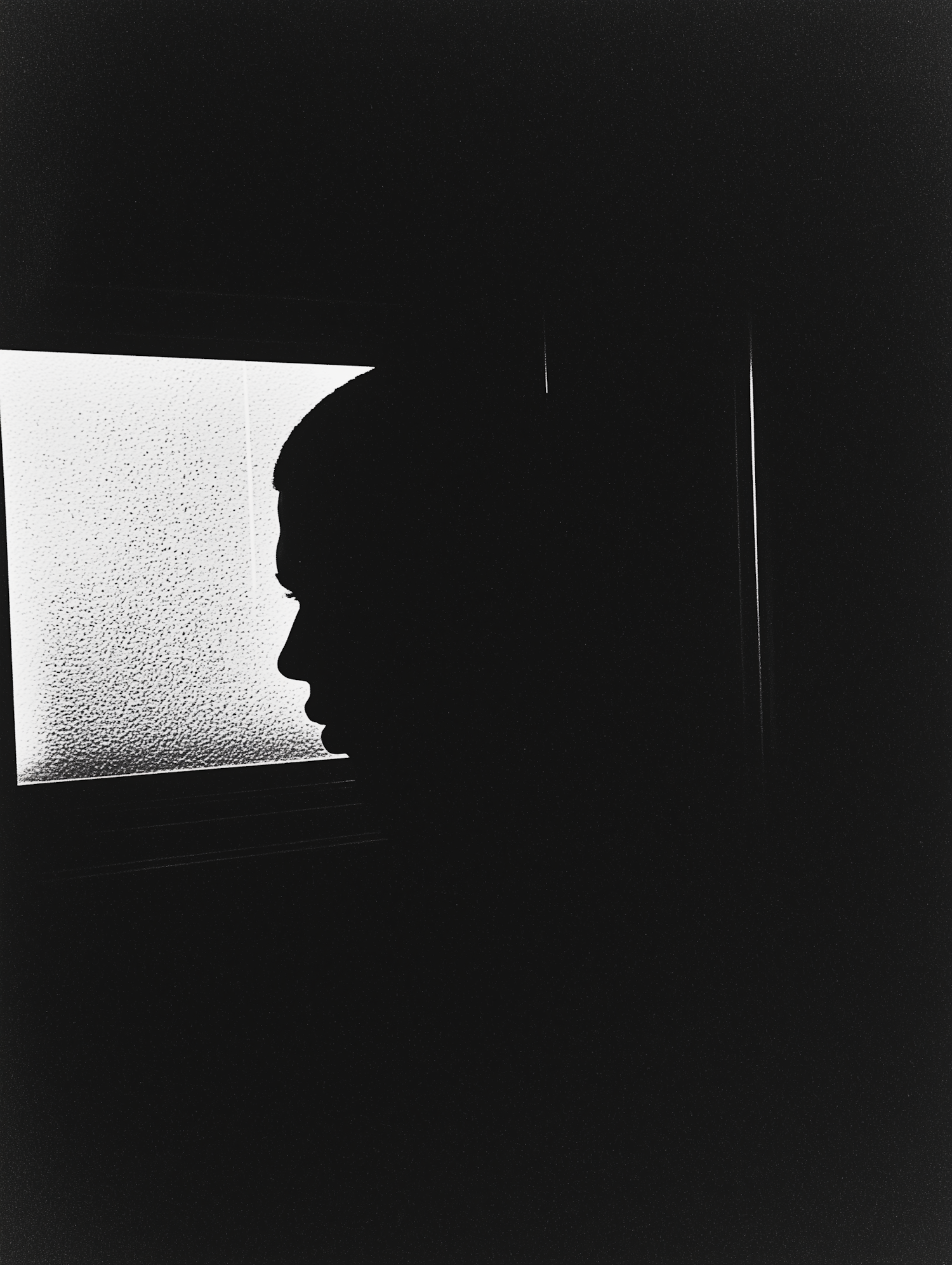 Silhouette of a person against a bright, textured background, creating a dramatic black and white contrast.