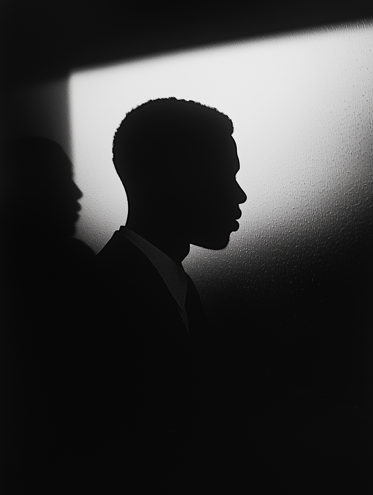Dramatic black and white silhouette of a man against a bright background, highlighting his profile and creating a striking contrast.