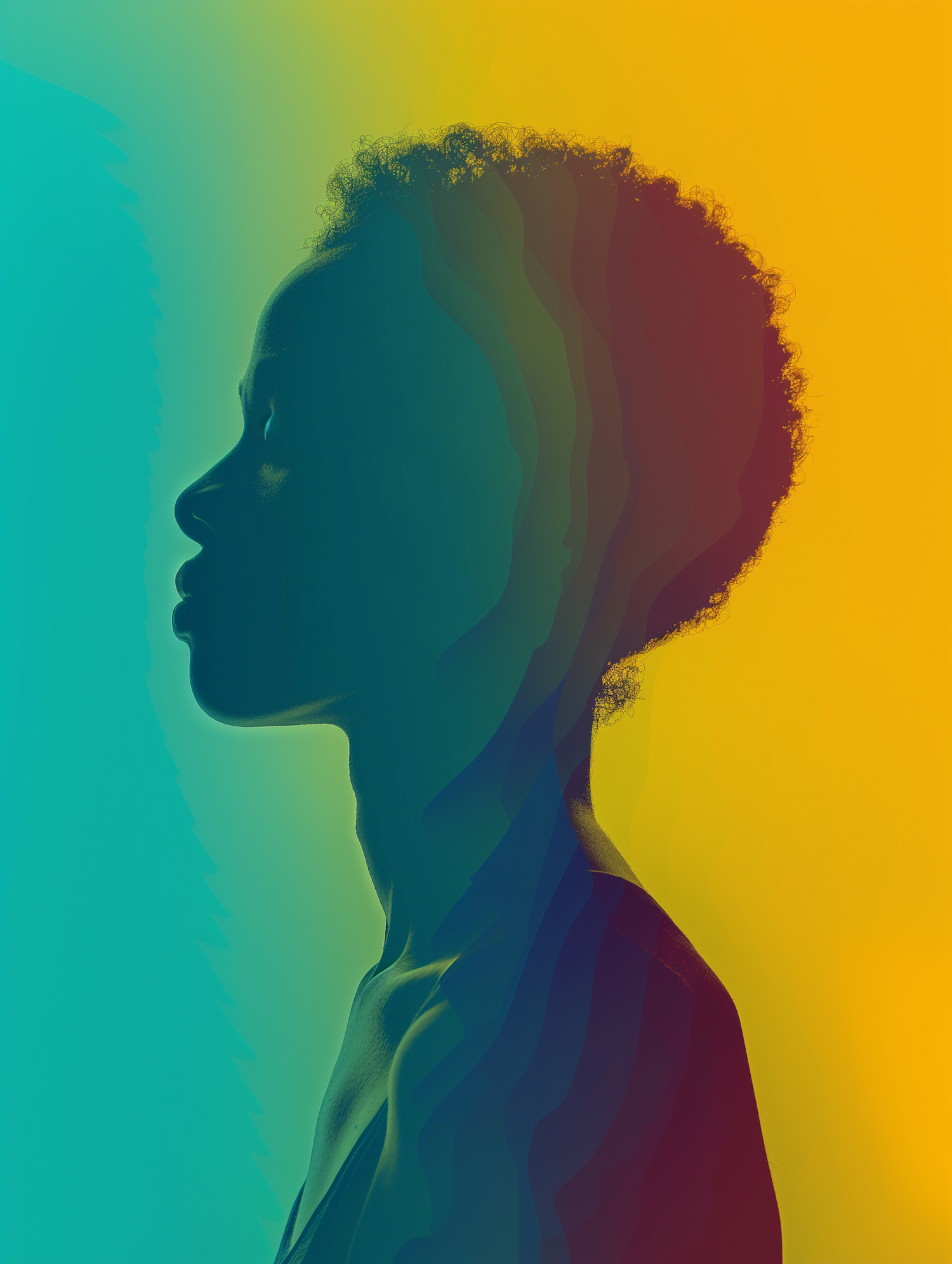 Abstract silhouette of a person with curly hair against a vibrant gradient background, featuring layered outlines and dynamic colors.