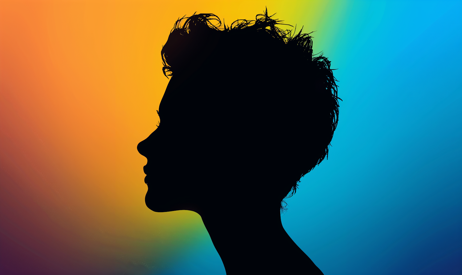 Silhouette of a person with short hair against a vibrant gradient background of orange, yellow, blue, and green hues.