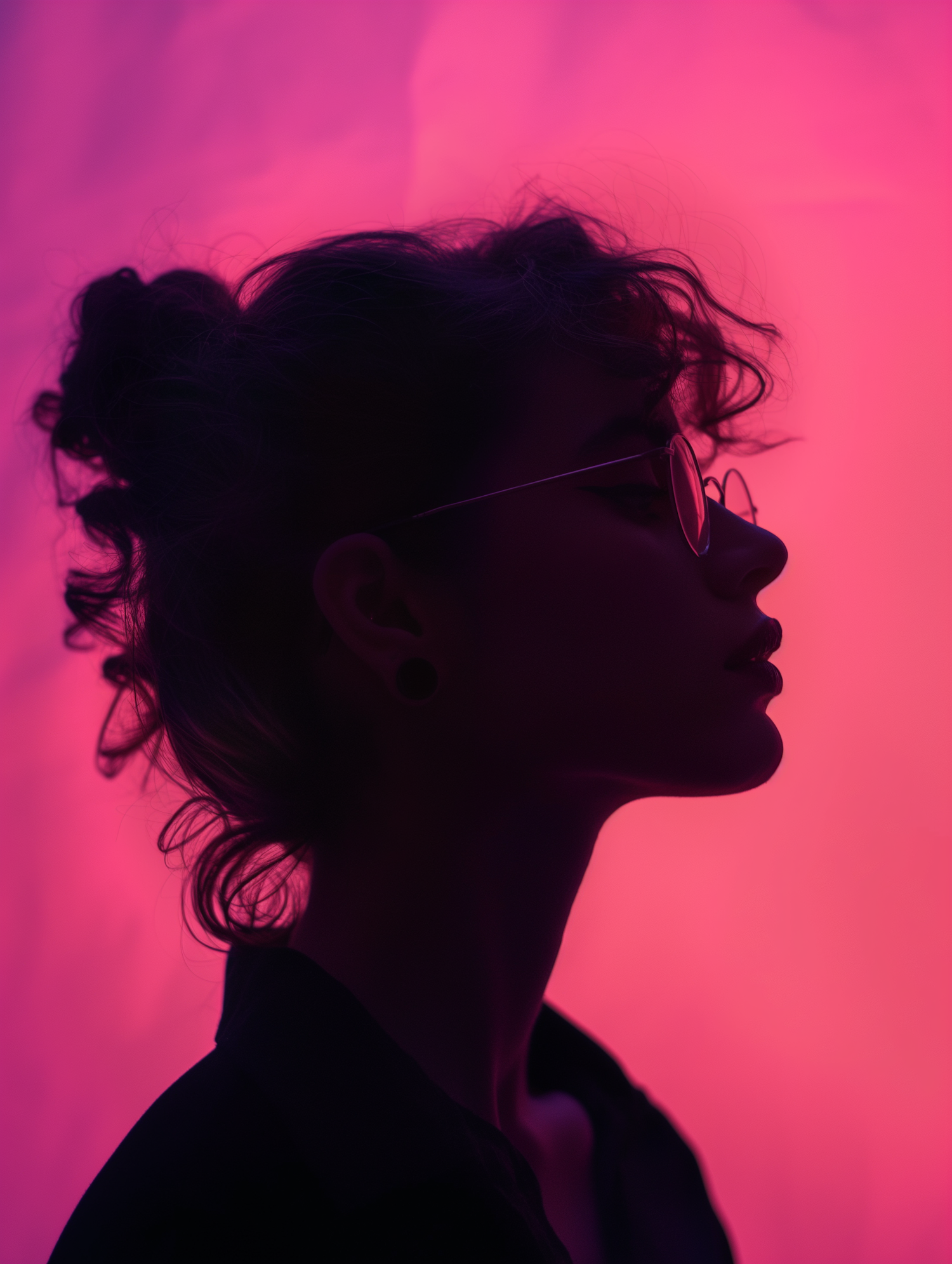 Silhouette of a person with glasses against a vibrant pink and purple gradient background, creating a dramatic and serene scene.