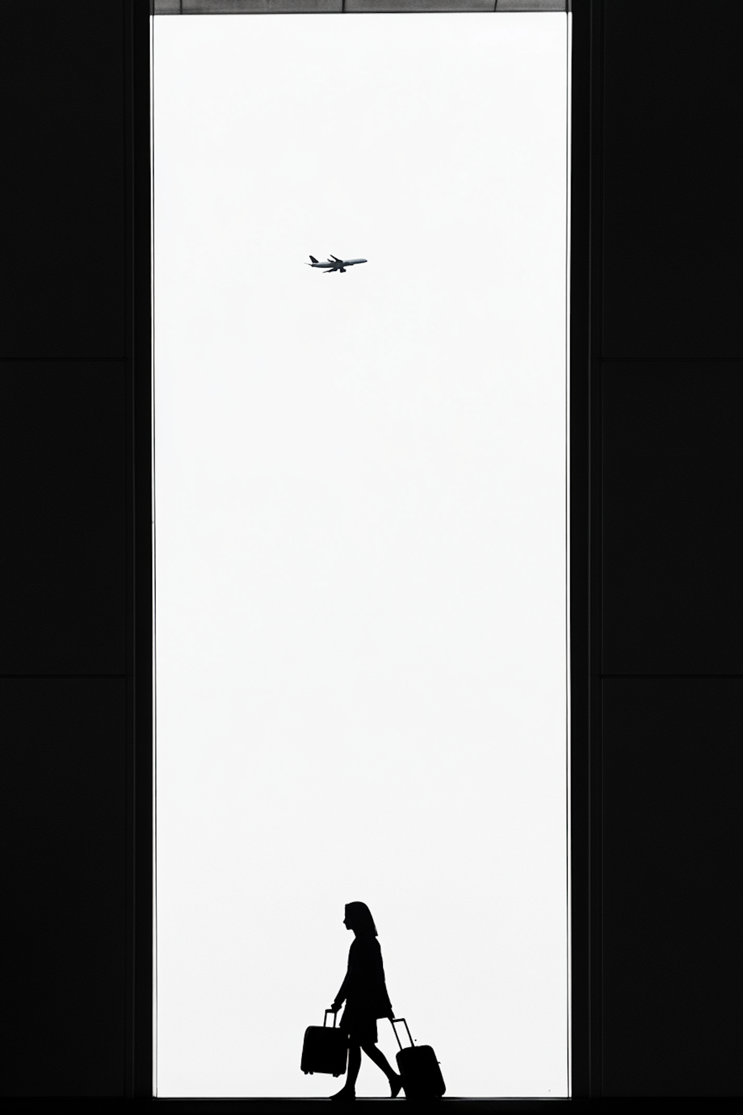 Silhouette of a traveler with suitcases against a bright window, with an airplane flying above, creating a striking travel scene.